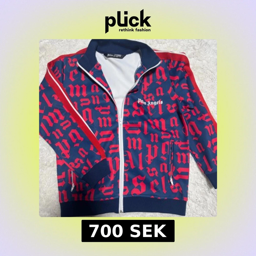 Denna färgstarka kofta från Palm Angels är i en snygg blå och röd färgkombination med ett iögonfallande mönster. Den är ganska använd men i mycket bra skick, och passar bra i storlek – perfekt för dig som vill sticka ut med en sportig och trendig look.