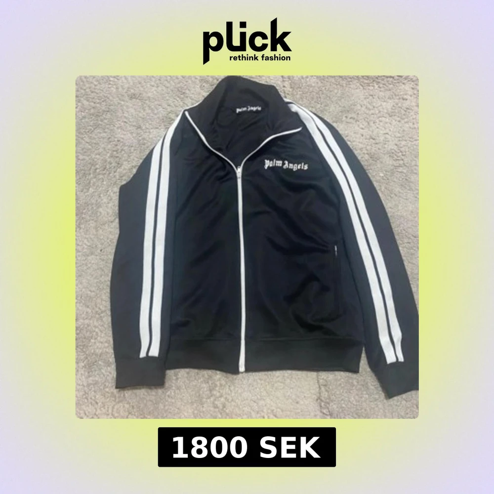 Snygg svart träningsjacka från Palm Angels med vita ränder längs ärmarna och dragkedja framtill. Jackan har en broderad logga på bröstet och är perfekt för en sportig look. Köpt för 4680 kr äkta kofta