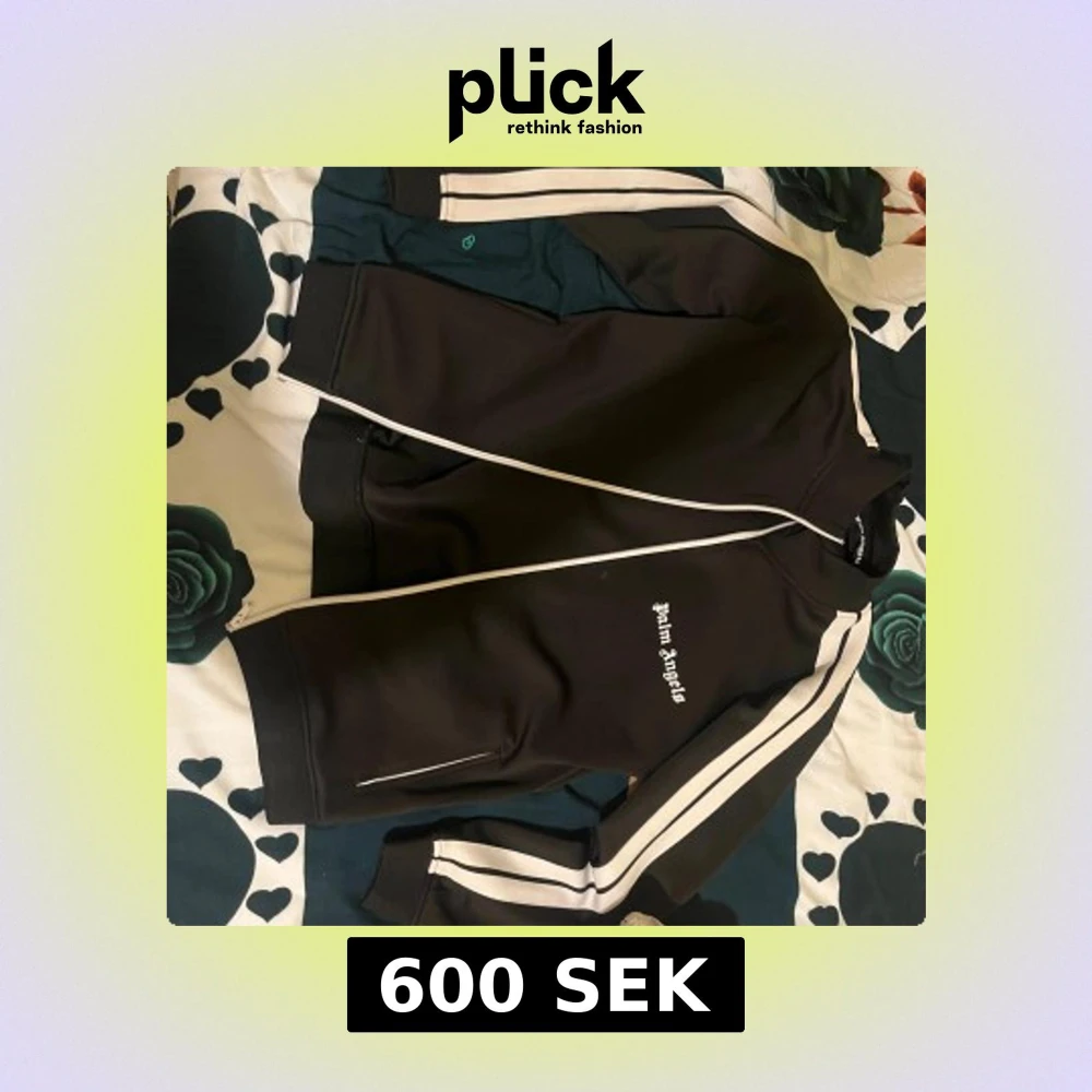 Svart track jacket från Palm Angels med vita ränder längs ärmarna och vit dragkedja. Jackan har ståkrage, broderad logga på bröstet och två fickor med dragkedja. Perfekt för en sportig och trendig look.