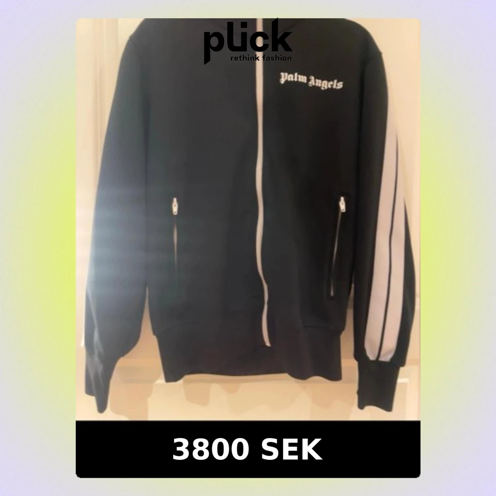 Svart track jacket från Palm Angels med vita ränder längs ärmarna och vit dragkedja. Tröjan har hög krage, två fickor med dragkedja och logga på bröstet. äkthets bevis på koftan finns!!