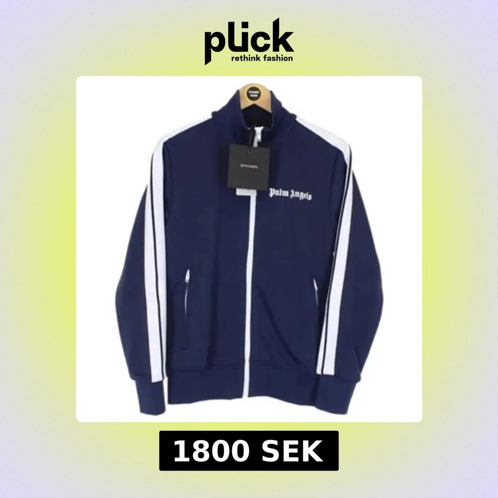 Snygg mörkblå track jacket från Palm Angels med vita ränder längs ärmarna. Jackan har dragkedja framtill och broderad logga på bröstet. Perfekt för en sportig look.