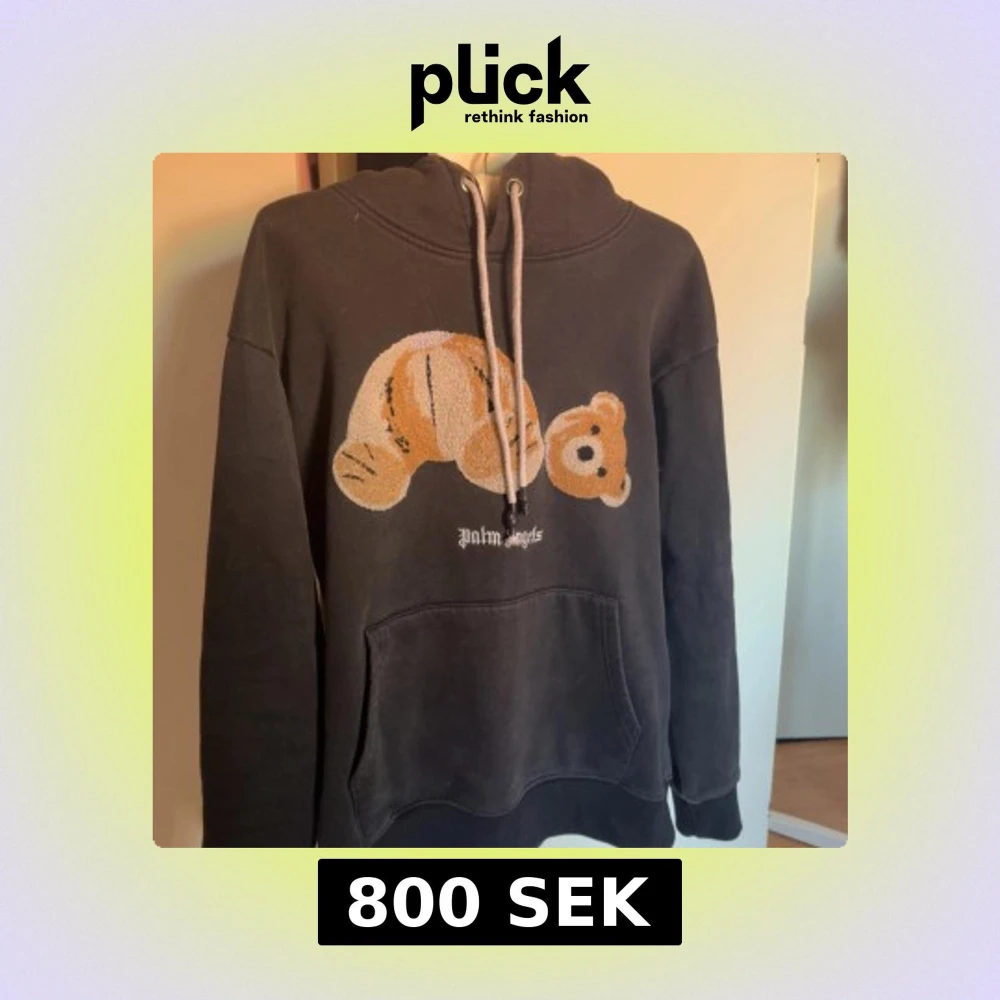 Svart hoodie från Palm Angels med stor broderad nalle på bröstet och vit logga under. Tröjan har huva med snörning och en stor magficka. Perfekt för dig som gillar streetwear och vill sticka ut med en unik detalj.