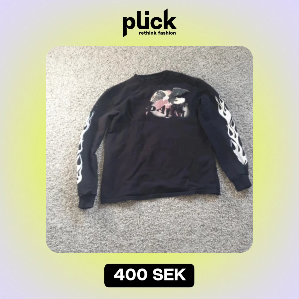 En svart palm angels tröja. Använd 2 gånger. Köptes för 1200kr och säljs för 400kr.