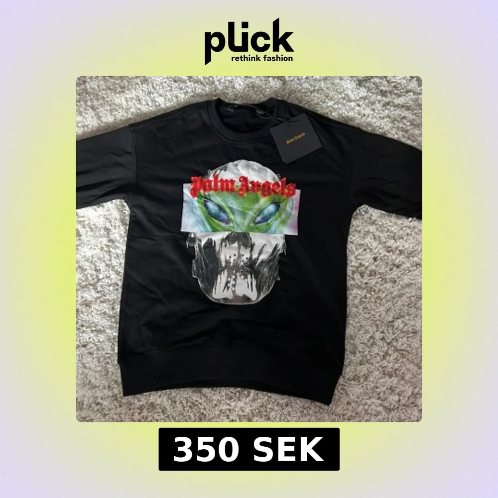 Svart sweatshirt från Palm Angels med ett stort, färgstarkt alien- och mask-tryck på bröstet samt röd Palm Angels-logga. Tröjan har rund hals, ribbade muddar och lång ärm. Perfekt för dig som gillar streetwear och unika prints.