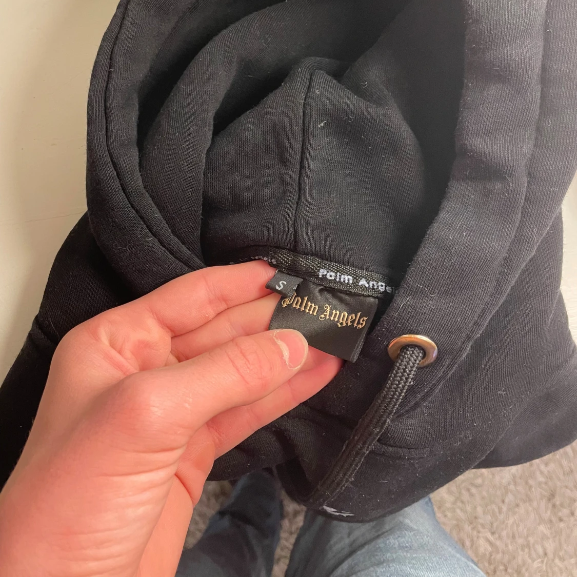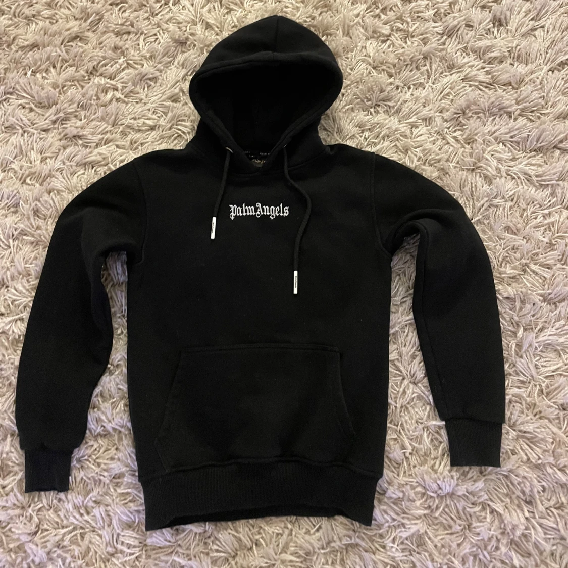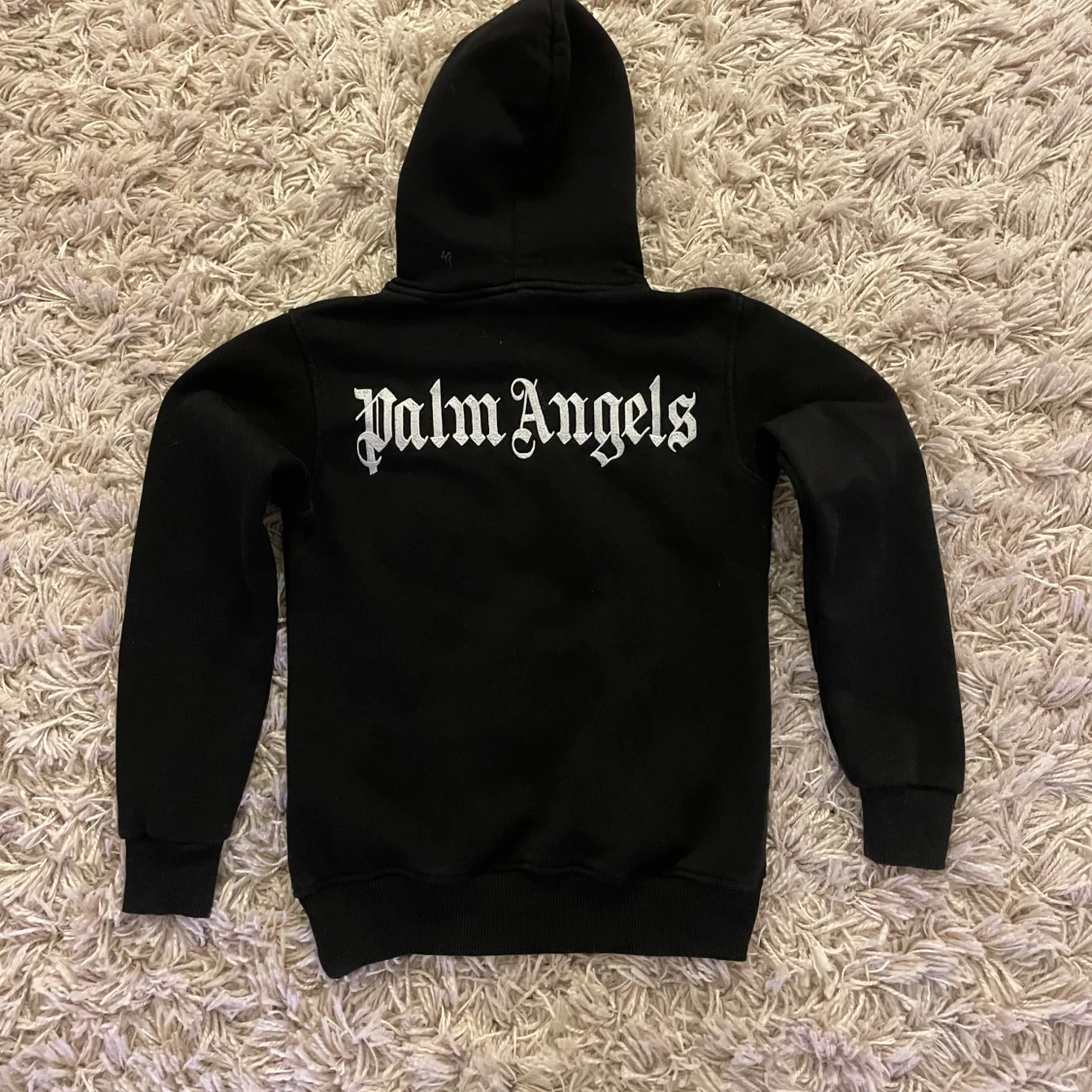 Svart hoodie från Palm Angels med stor vit logga på ryggen och mindre logga på bröstet. Klassisk känguruficka framtill, snörning i huvan och ribbade muddar. Perfekt för dig som gillar streetwear och vill sticka ut med en ikonisk look storleken är s i barn och är 60cm lång och 43cm bred