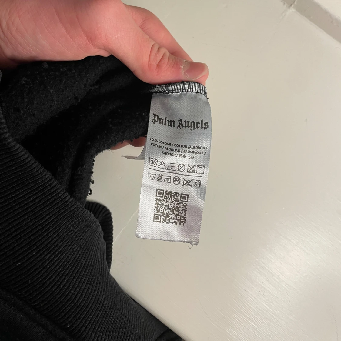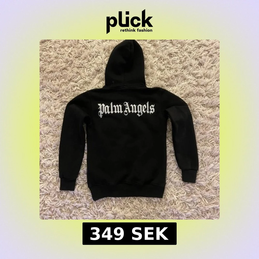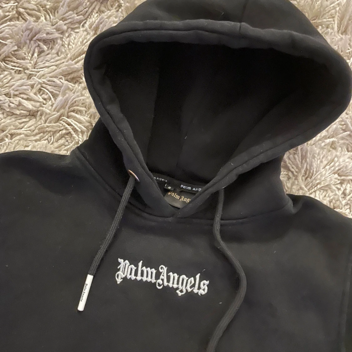 Svart hoodie från Palm Angels med stor vit logga på ryggen och mindre logga på bröstet. Klassisk känguruficka framtill, snörning i huvan och ribbade muddar. Perfekt för dig som gillar streetwear och vill sticka ut med en ikonisk look storleken är s i barn och är 60cm lång och 43cm bred