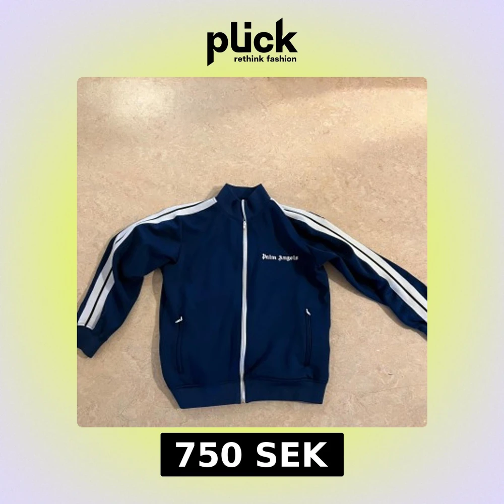 Snygg marinblå track jacket från Palm Angels med vita ränder längs ärmarna och vit dragkedja. Jackan har hög krage, två fickor med dragkedja och logga på bröstet. Tillverkad i 100% polyester för en sportig vibe. Varan är i perfekt skick. Priset går att diskutera vid snabb affär