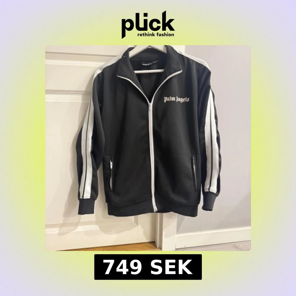 Svart track jacket från Palm Angels med vita ränder längs ärmarna och vit dragkedja. Klassisk sportig look med hög krage och logga på bröstet. Två fickor med dragkedja och ribbade muddar