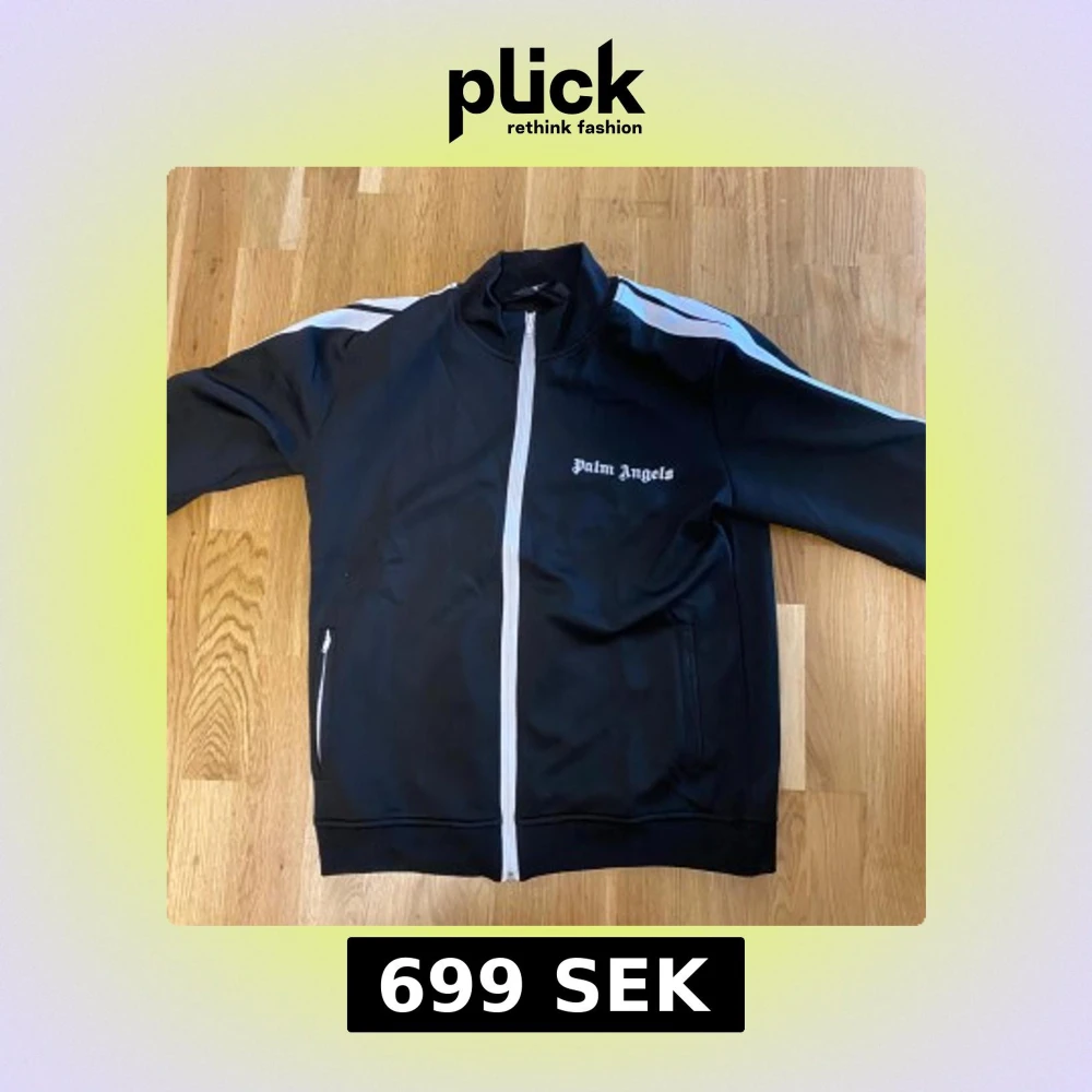 Svart track jacket från Palm Angels med vita ränder längs ärmarna och vit dragkedja. Jackan har ståkrage, två fickor med dragkedja och logga på bröstet. Materialet är en mix av bomull och polyester för en sportig vibe.