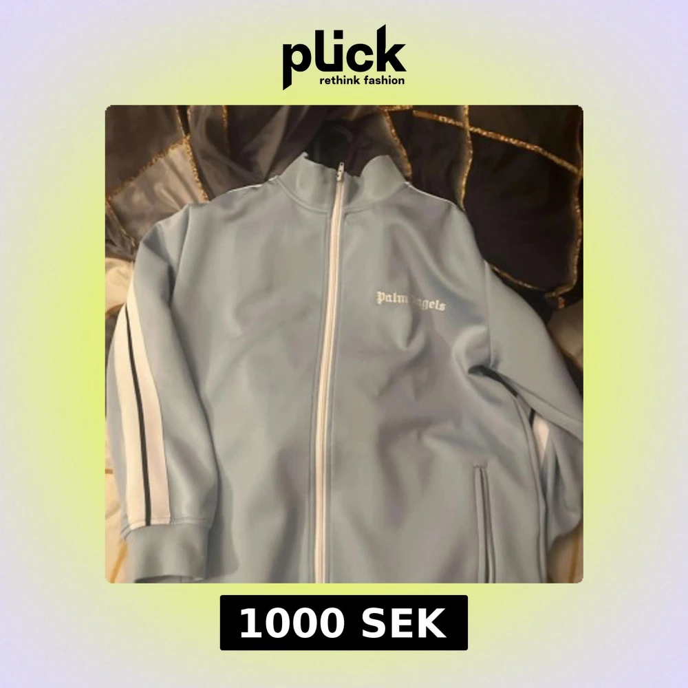 Säljer en ljusblå zip hoodie från Palm Angels med vita ränder längs ärmarna och logga på bröstet. Tröjan har hög krage, hel dragkedja och ribbade muddar. Perfekt för en sportig och trendig look. Du får byxorna med också.