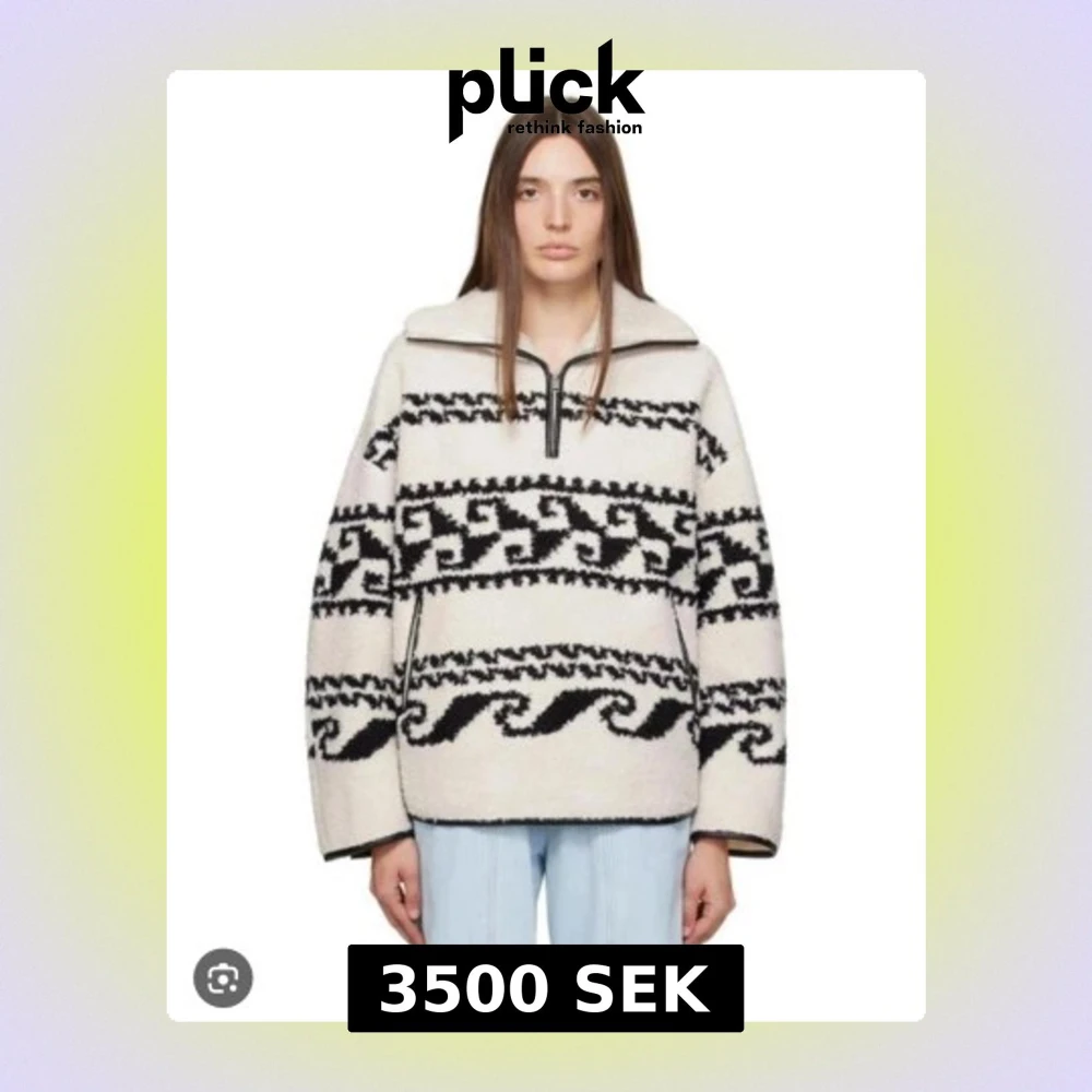 Supermysig vit fleece-tröja från Isabel Marant Étoile med svart grafiskt mönster. Oversized passform, hög krage och half zip-dragkedja framtill. Nypris runt 8000kr säljer för 3500. Jätte fint skick och bara nevöns ett fåtal gånger
