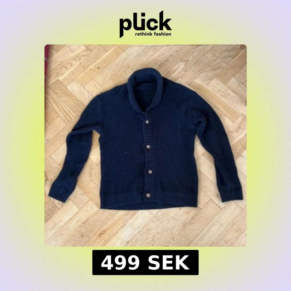 Säljer en mörkblå stickad kofta med grov struktur och bred ribbad krage. Perfekt för lager-på-lager och chillare dagar.
