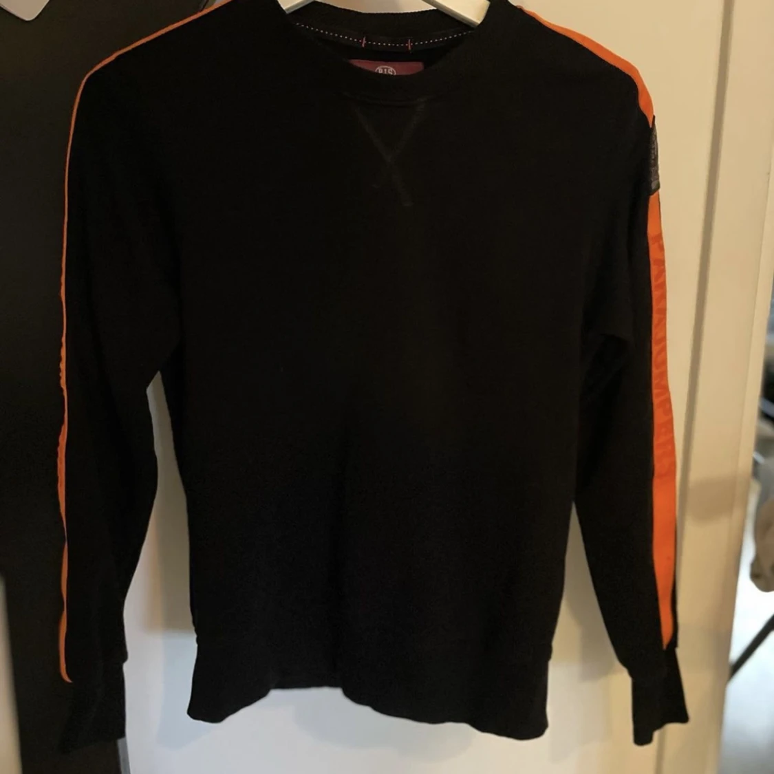 Säljer en parajumper tröja pågrund av att tröttna att använda den, den är i storlek 164/S och är i bra skick, den är svart och orange, köpt nypris för 2100.