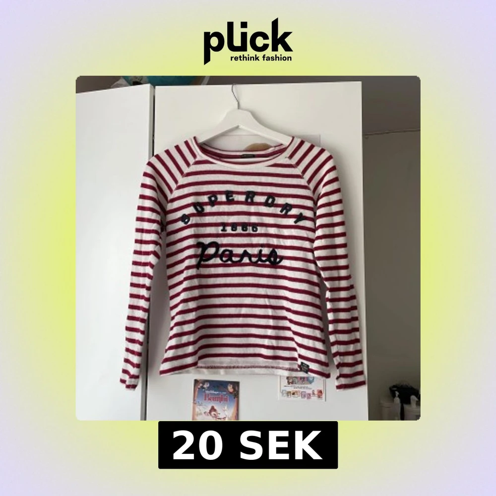Säljer en vit och röd långärmad tröja från Superdry. Tröjan har ett klassiskt randigt mönster och rund hals. Det står på tröjan att det är storlek XS men passar även S och M beroende på hur man vill att den ska sitta❤️