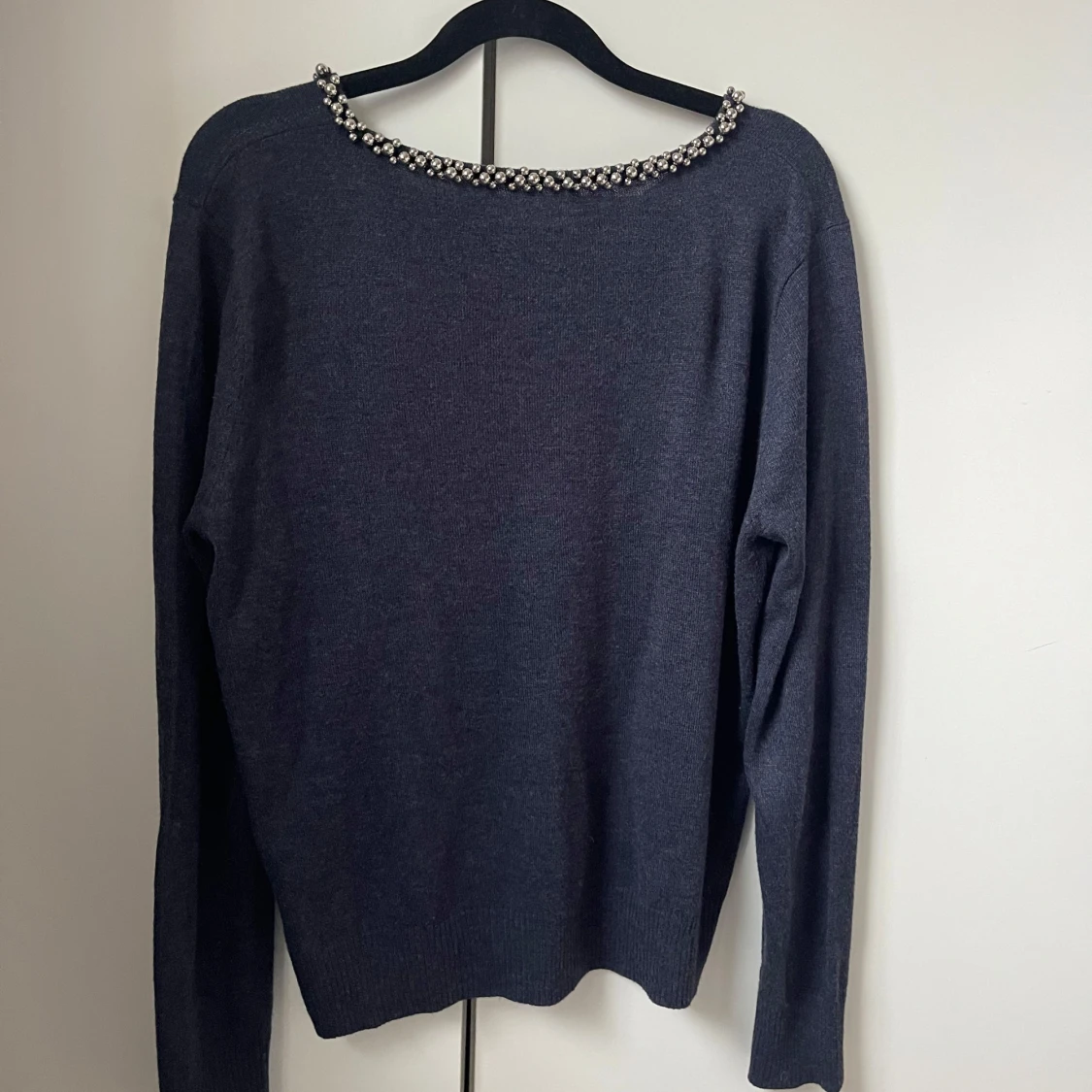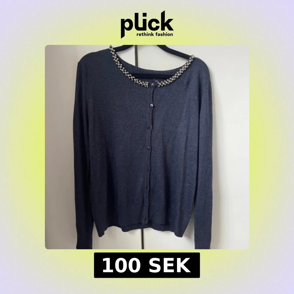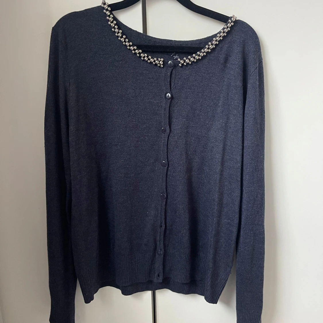Mörkblå kofta med pärlor runt kragen. Så fin