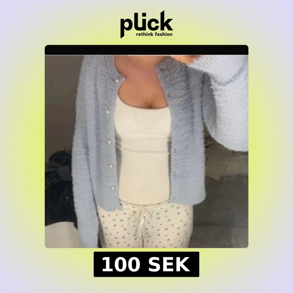 Mysig ljusblå kofta med pärlknappar framtill. Koftan har lång ärm och är gjord i ett fluffigt, stickat material. Perfekt att slänga över en topp för en avslappnad look.