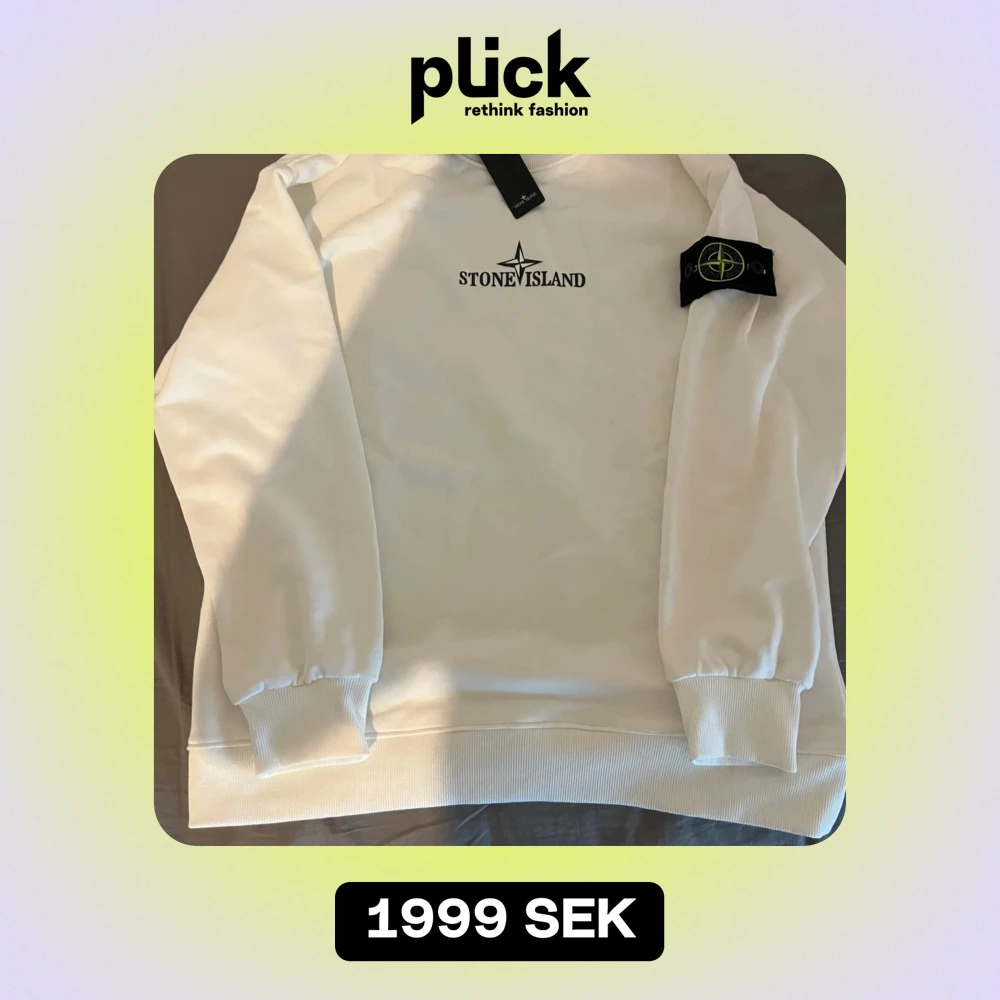 Snygg vit sweatshirt från Stone Island med deras ikoniska logga på bröstet och en stor logga på ryggen. Tröjan har långa ärmar och ribbade muddar vid ärmslut och nederkant. Perfekt för en stilren och avslappnad look. Sälja pga behöver pengar priset går att diskutera