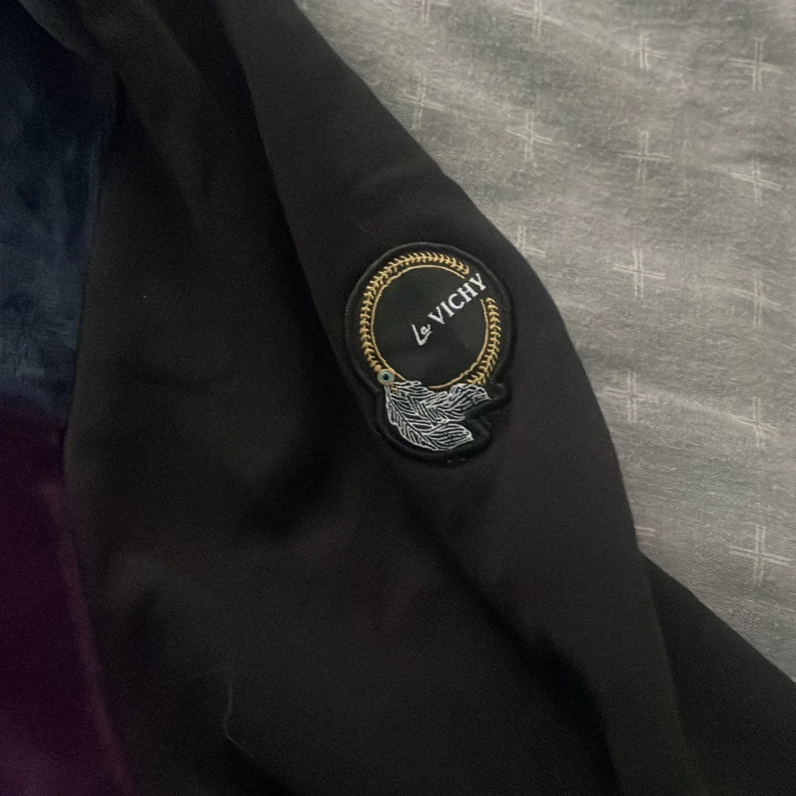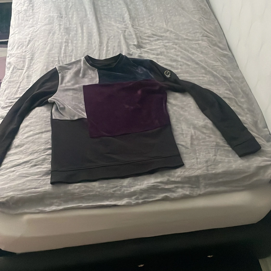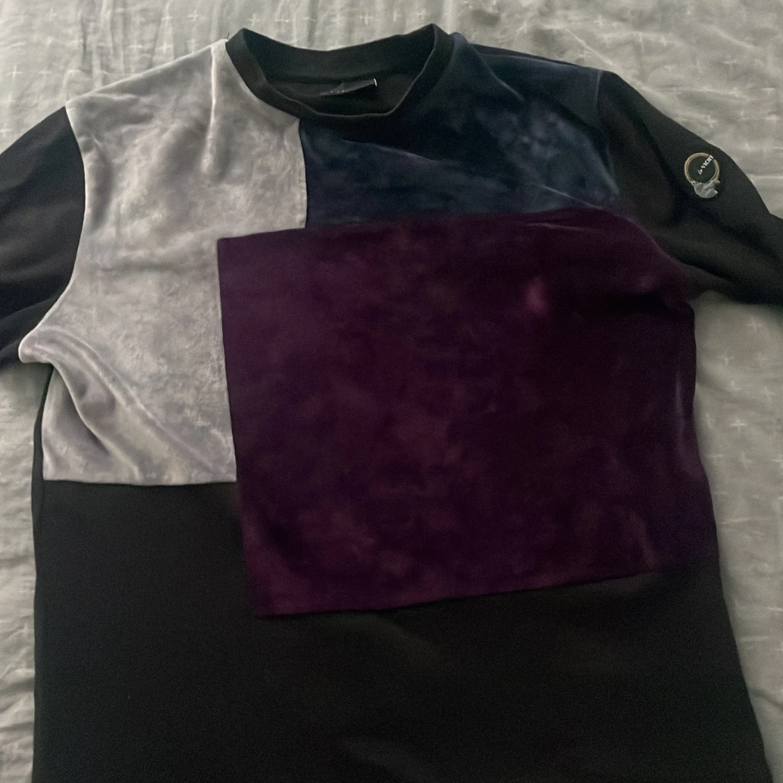 Unik långärmad sweatshirt från Le Vichy med patchwork-design i mörklila, silver och svart. Tröjan har en cool badge på ärmen och är gjord i mjuk sammet och polyester. Perfekt för dig som gillar statement-plagg och vill sticka ut med din stil.