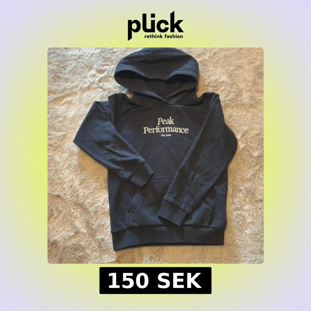 Säljer en mörkblå hoodie från Peak Performance med vit text på bröstet. Tröjan har en klassisk känguruficka och en bekväm huva. Perfekt för kyliga dagar!