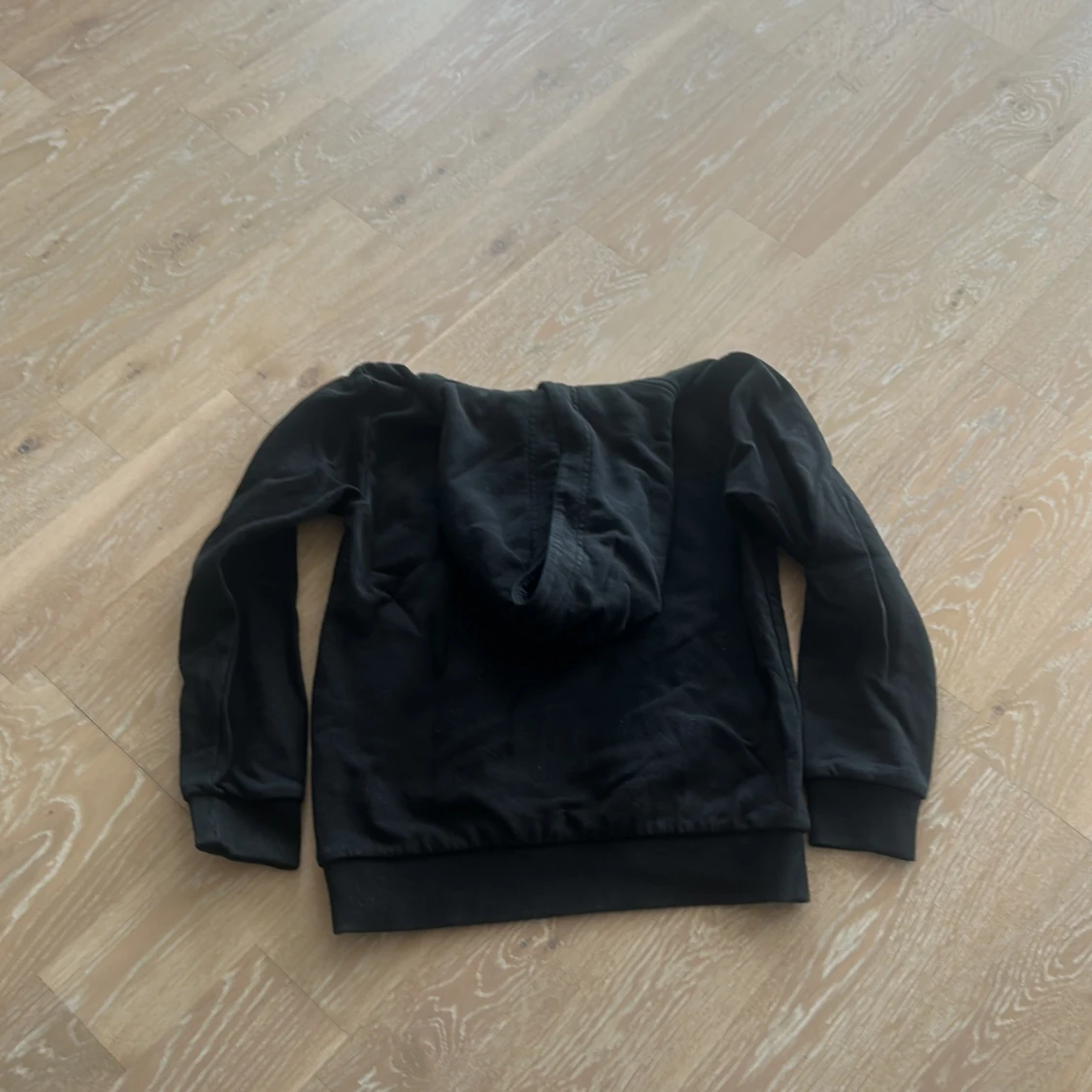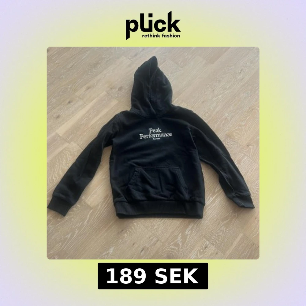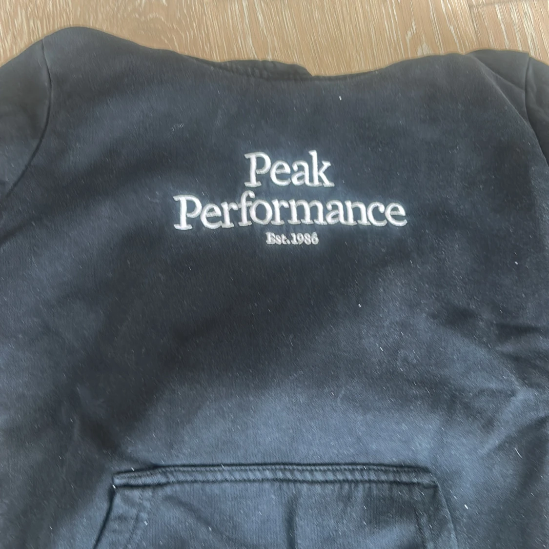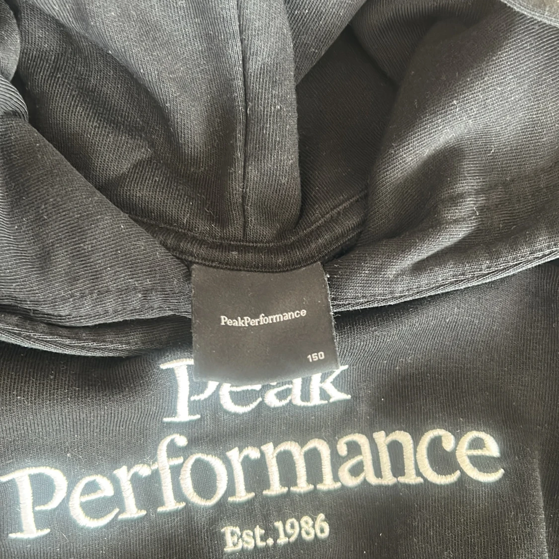 Säljer en svart hoodie från Peak Performance med vit logga på bröstet. Tröjan har huva och en stor magficka framtill. Perfekt för en avslappnad stil och enkel att matcha med det mesta.