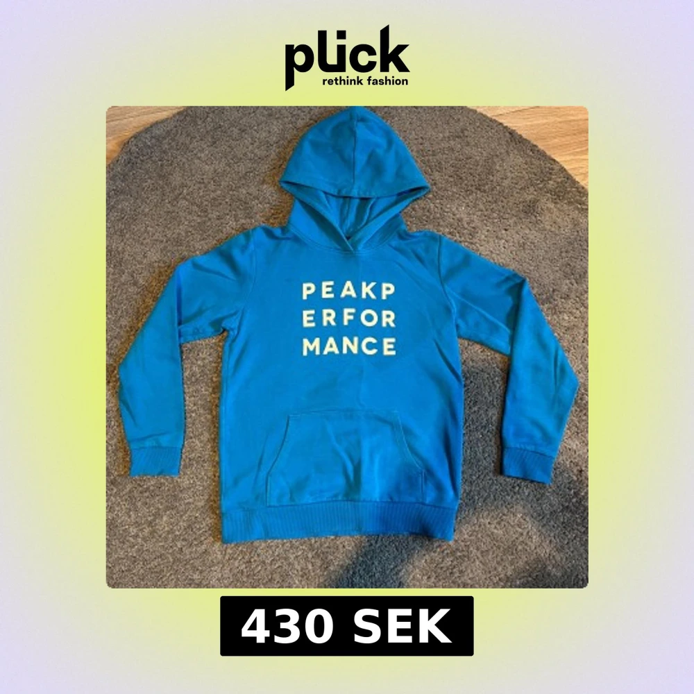Säljer en snygg blå hoodie från Peak Performance med text på framsidan. Tröjan har en klassisk känguruficka och en bekväm luva.