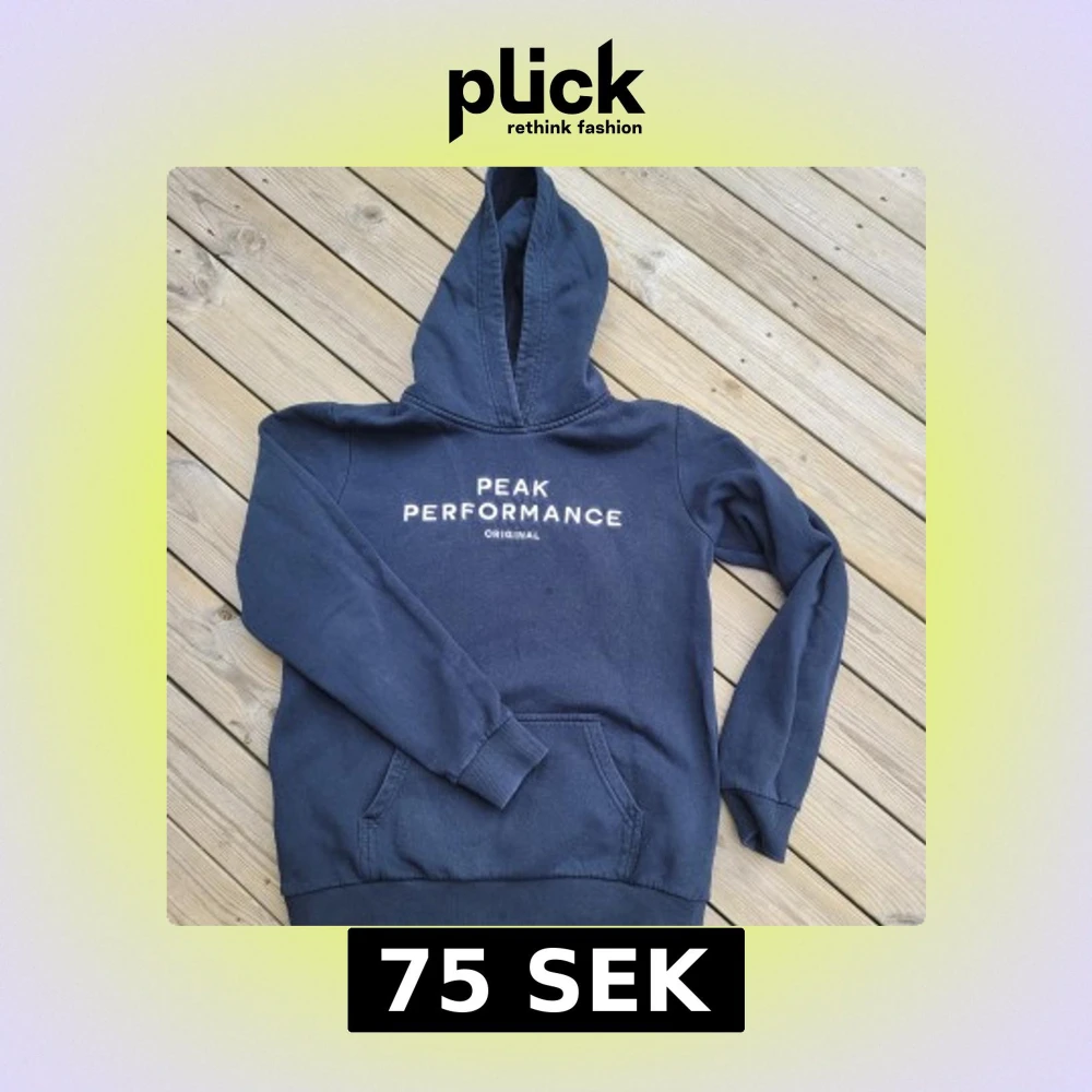 Säljer en snygg mörkblå hoodie från Peak Performance med vit text på bröstet. Den har en klassisk känguruficka och ribbade muddar vid ärmslut och nederkant. Perfekt för en avslappnad stil.