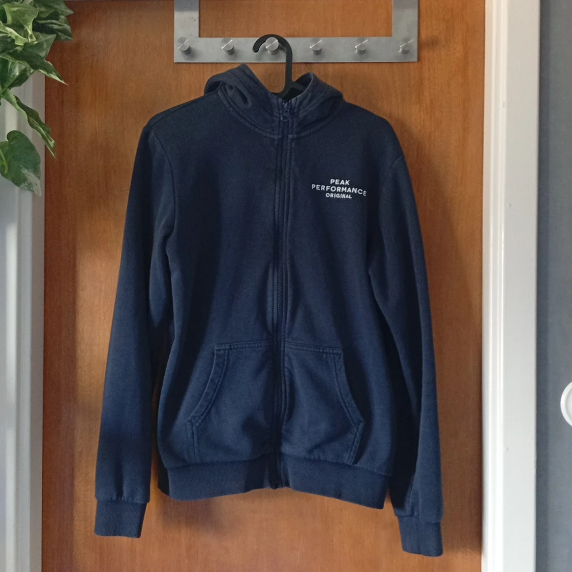 Mörkblå Peak Performance kofta Stilren kofta med dragkedja och huva, utrustad med två fickor framtill och en diskret logga på bröstet. Bekväm passform och hög kvalitet – perfekt för både vardag och träning ✨ I fint skick. Hör gärna av dig vid intresse eller frågor 💬