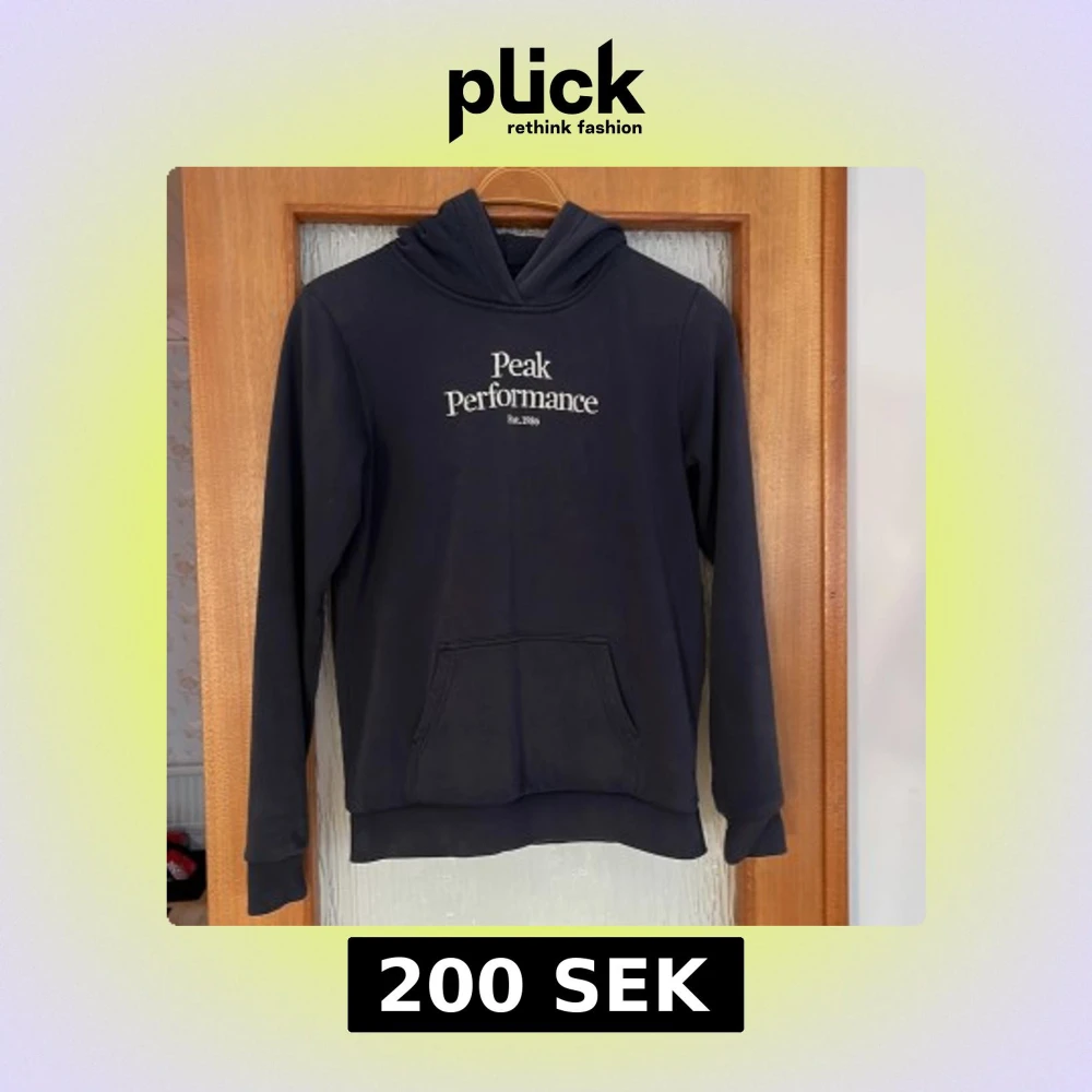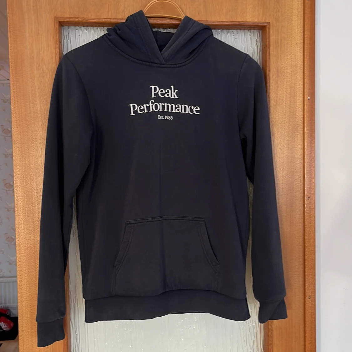 Säljer en stilren marinblå hoodie från Peak Performance med vit logga på bröstet. Tröjan har en klassisk känguruficka och långa ärmar. Perfekt för en avslappnad look.