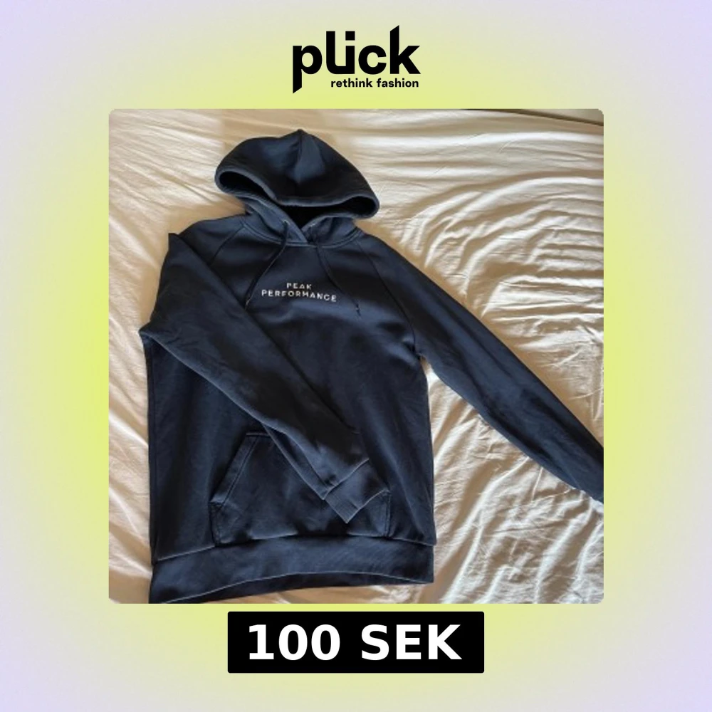 Säljer en mörkblå hoodie från Peak Performance med vit logga på bröstet. Klassisk modell med huva, dragsko och känguruficka. Perfekt för en avslappnad stil och enkel att matcha med jeans eller joggers.