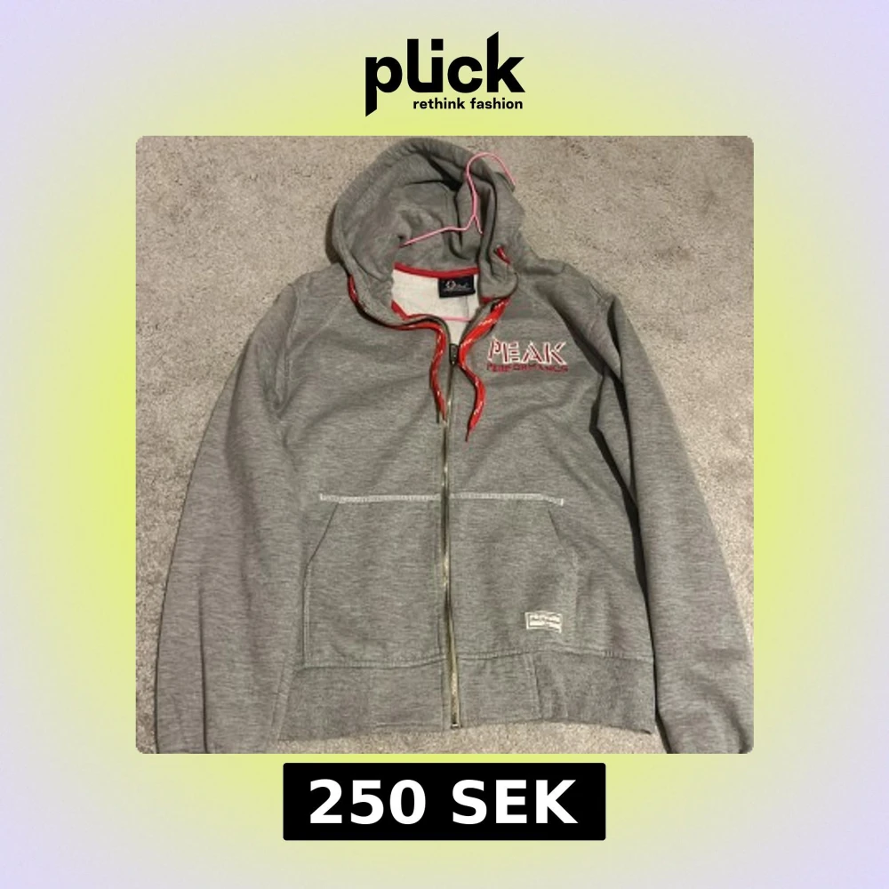 Säljer en grå hoodie från Peak Performance med röd text och dragkedja. Den har en justerbar huva med röda snören, storlek L men tycker den är lite liten för att vara L. Säljer för den är för stor för mig☺️