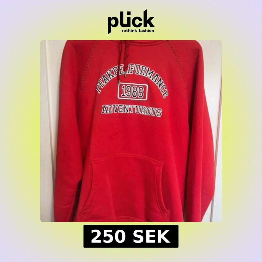 Säljer en röd hoodie från Peak Performance stl: L med broderad text '1986 Adventurous' på bröstet. Tröjan har huva med snörning, magficka och coola kontrastsömmar längs axlarna. Perfekt för dig som gillar sportig och avslappnad stil.
