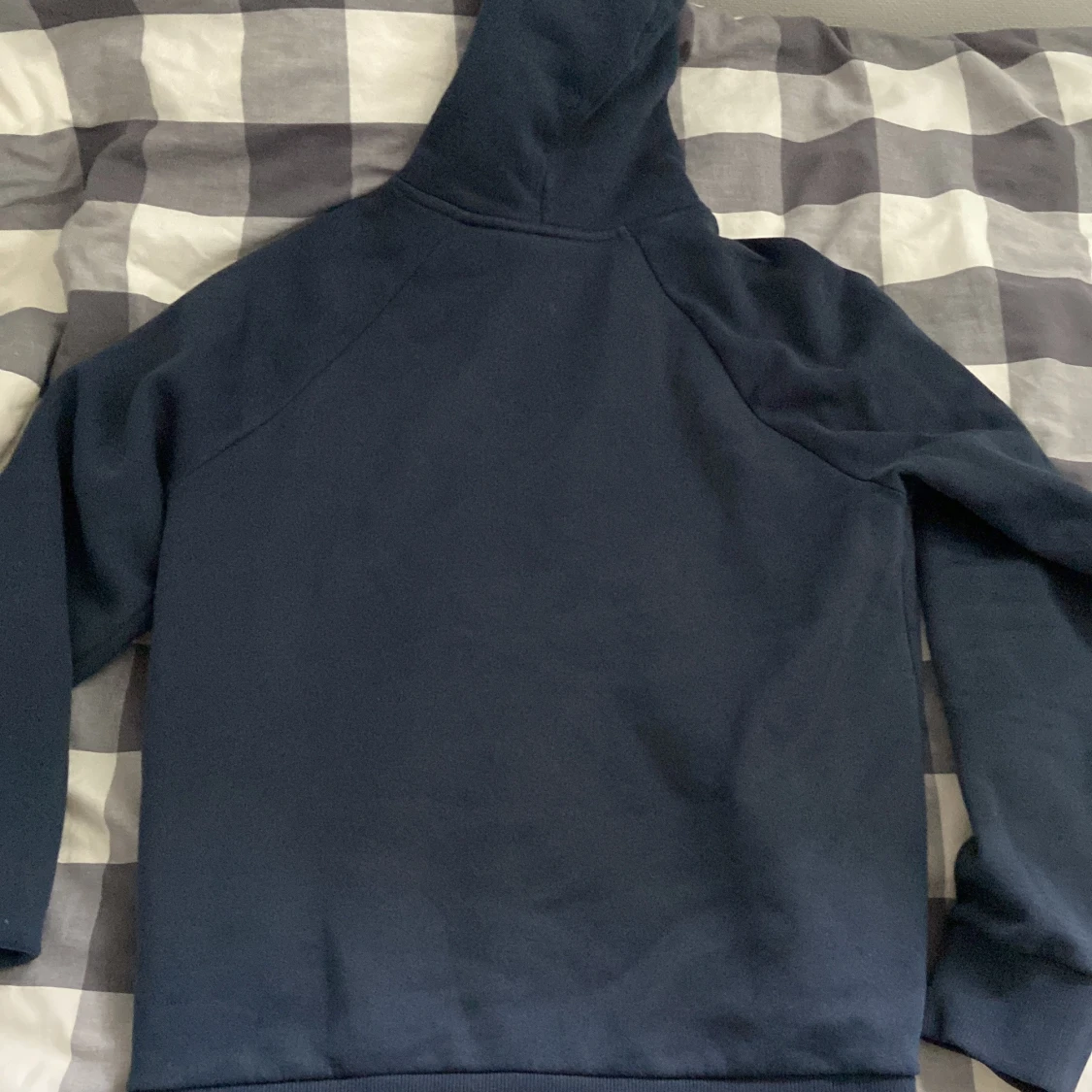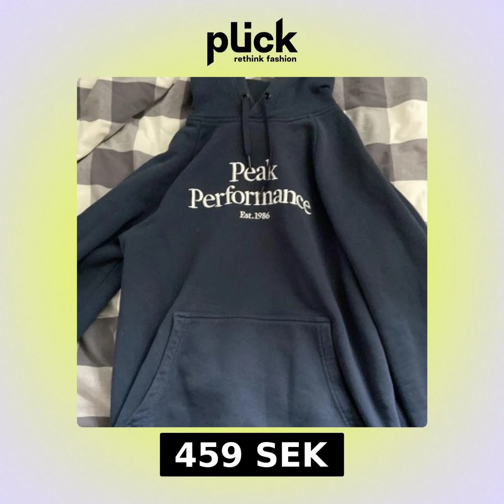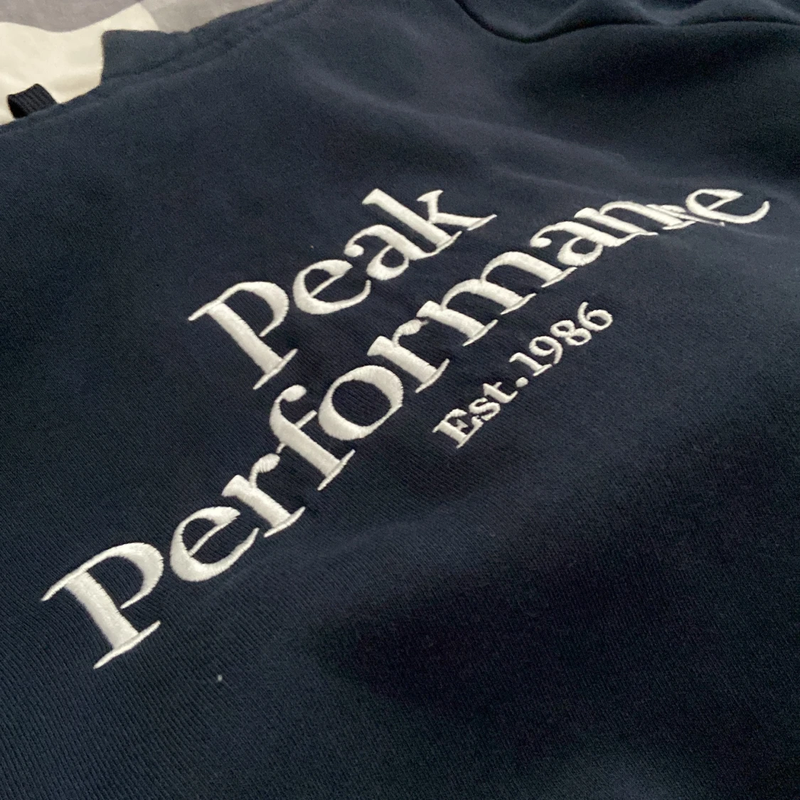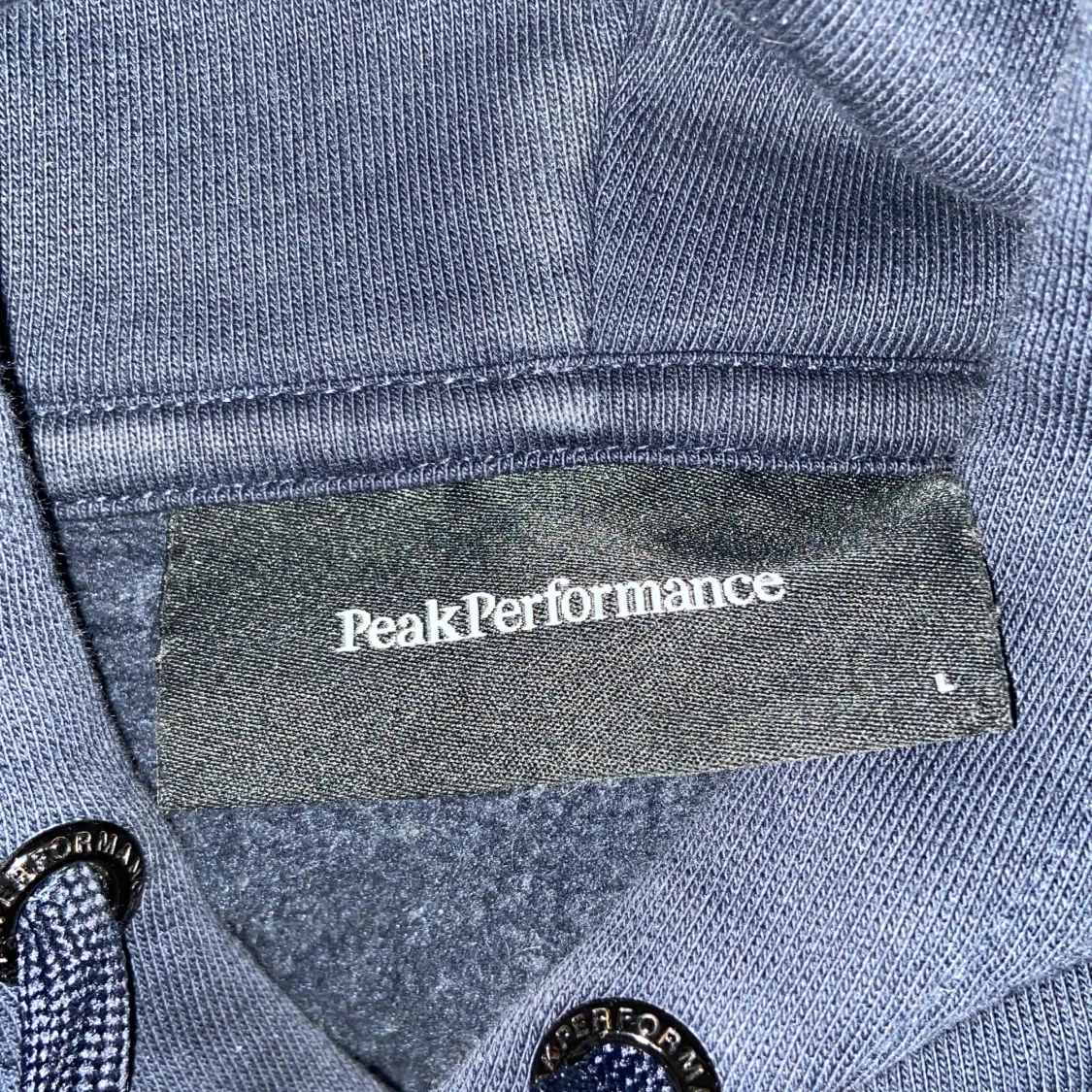 Snygg mörkblå hoodie från Peak Performance i storlek L. Klassisk modell med stor vit logga framtill, huva med snörning och känguruficka. Perfekt för chill dagar eller när du vill ha en clean och sportig look.