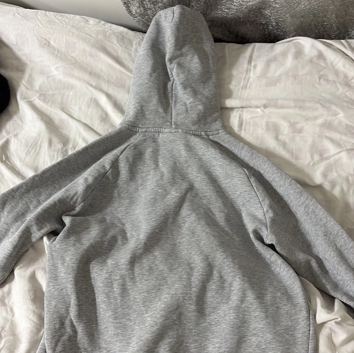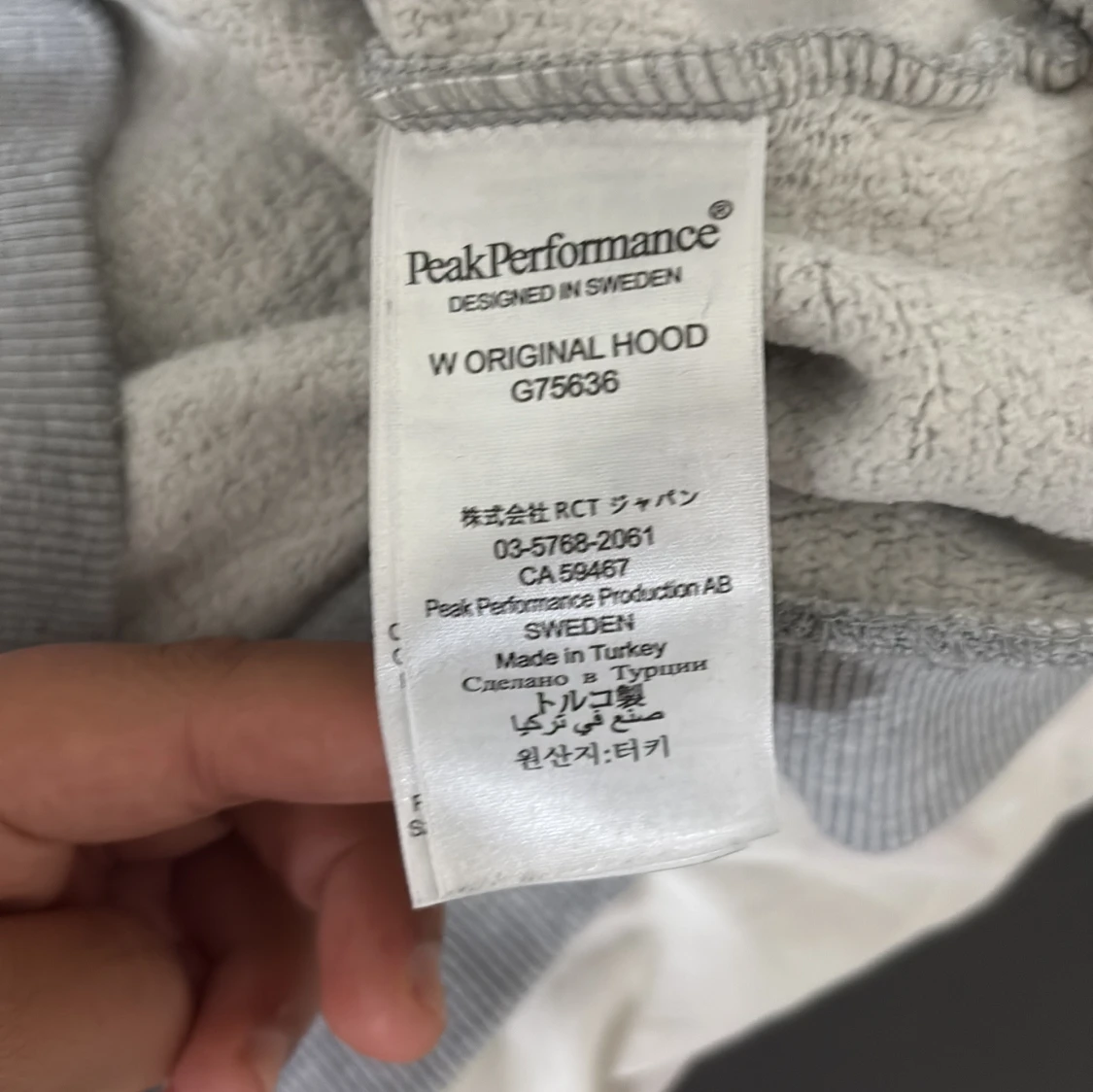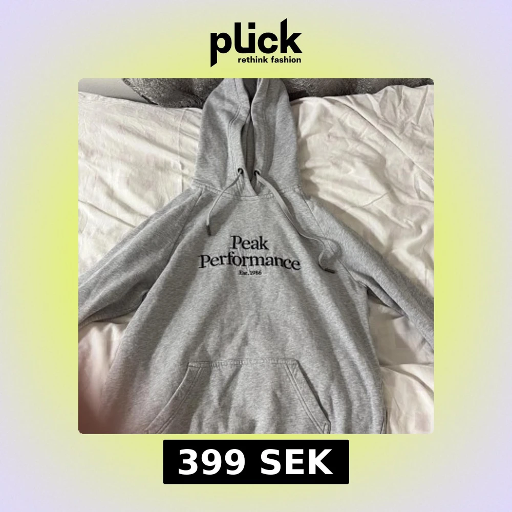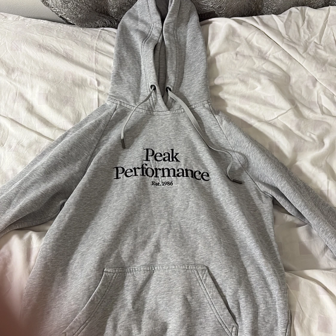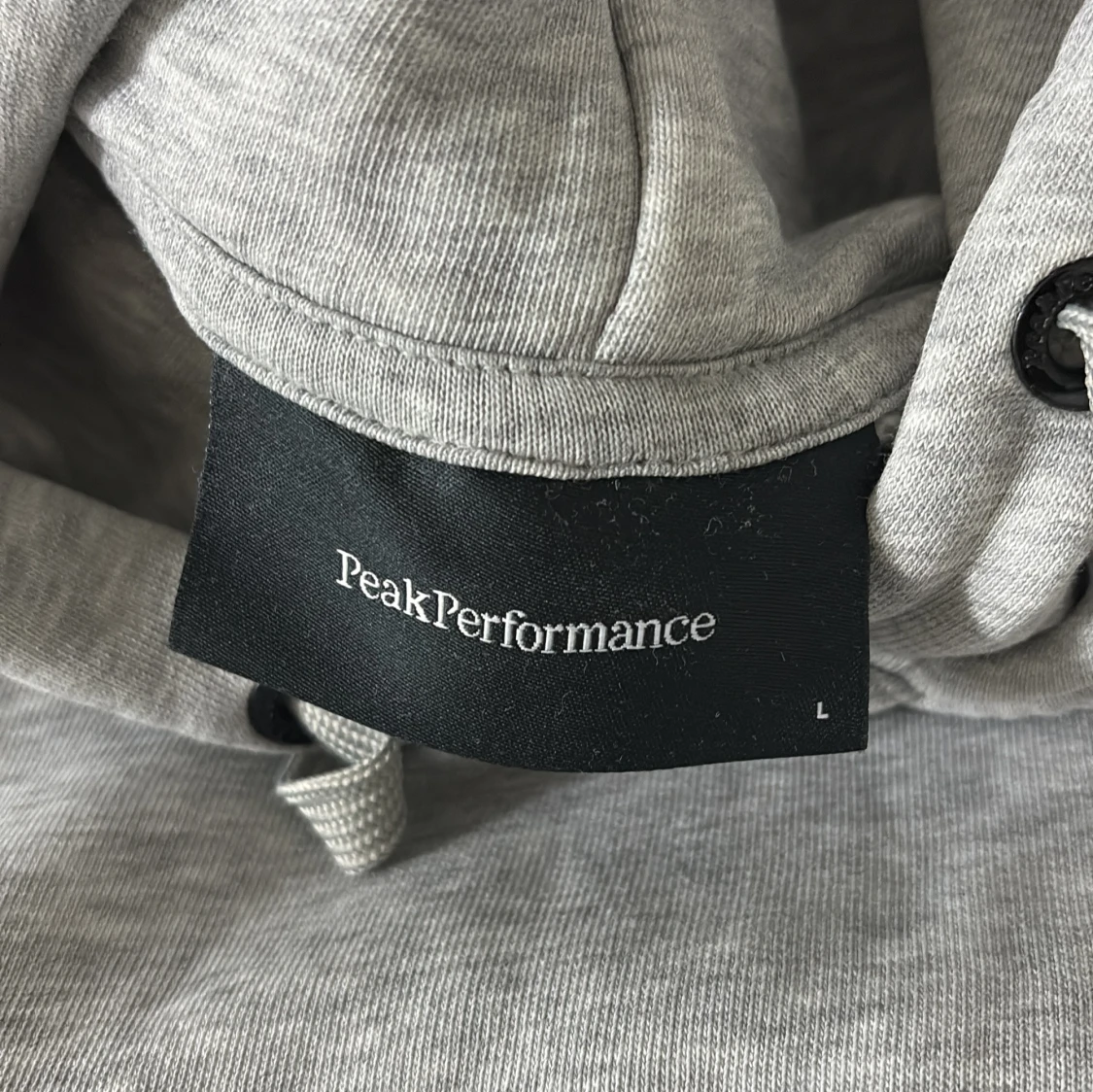 Snygg grå hoodie från Peak Performance med svart broderad logga på bröstet. Klassisk modell med huva, snörning och stor känguruficka framtill. Tillverkad i mjuk bomullsmix, perfekt för chill eller träning. Passar dig som gillar enkel och stilren streetwear.