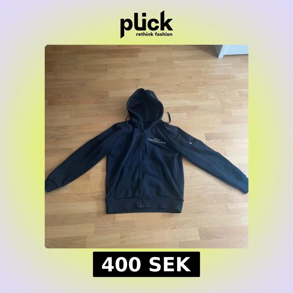Svart hoodie med dragkedja från Peak Performance. Tröjan har huva med dragsko och vit logga på bröstet. Perfekt för en avslappnad stil och enkel att matcha med andra plagg.
