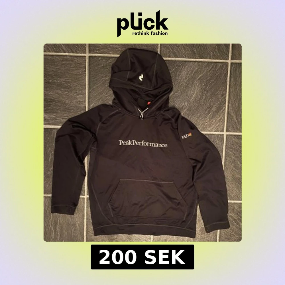 Svart hoodie från Peak Performance med vit logga på bröstet och R&D-detalj på ärmen i storlek M