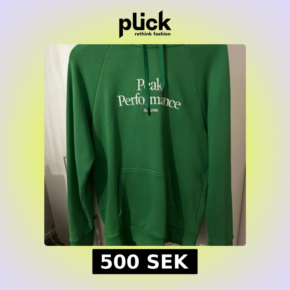 Säljer en grön hoodie från Peak Performance med vit broderad logga på bröstet och känguruficka framtill. Tröjan har huva med dragsko och långa ärmar. Perfekt för en avslappnad stil.
