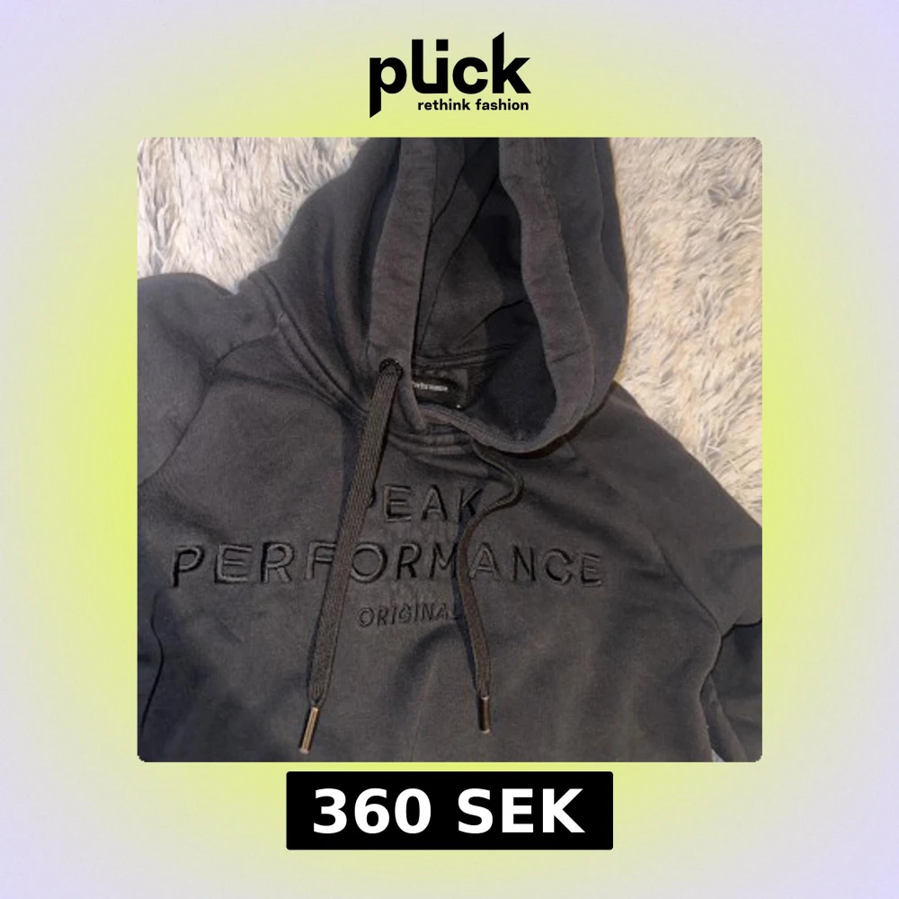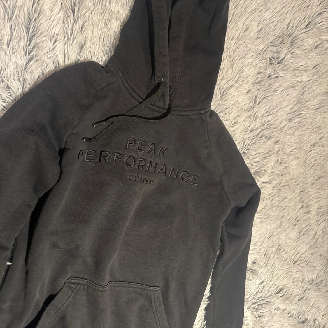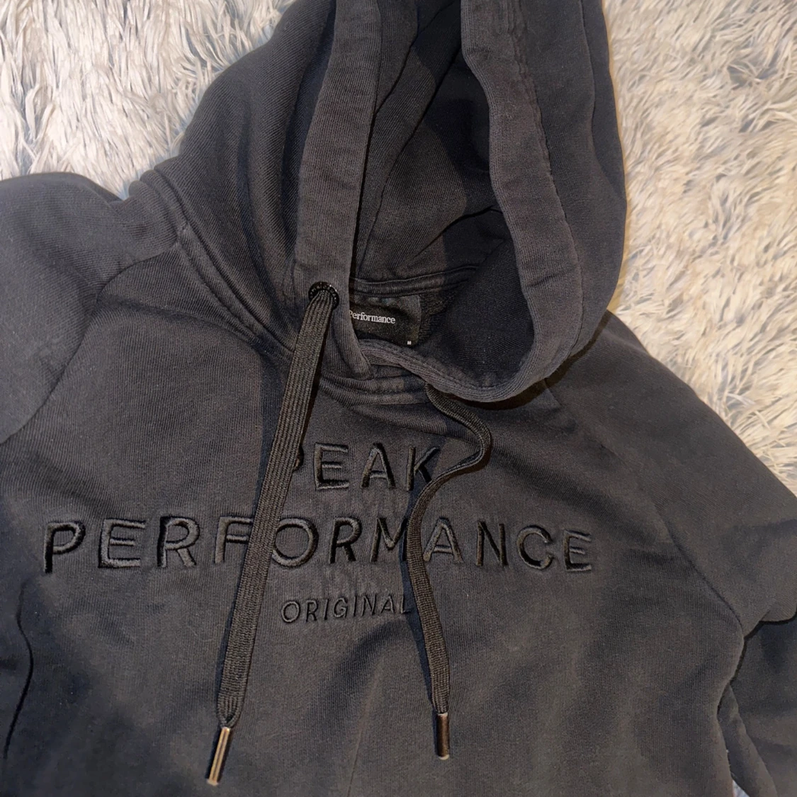Säljer en svart hoodie från Peak Performance med broderad logga framtill. Tröjan har huva med snörning och en stor magficka.
