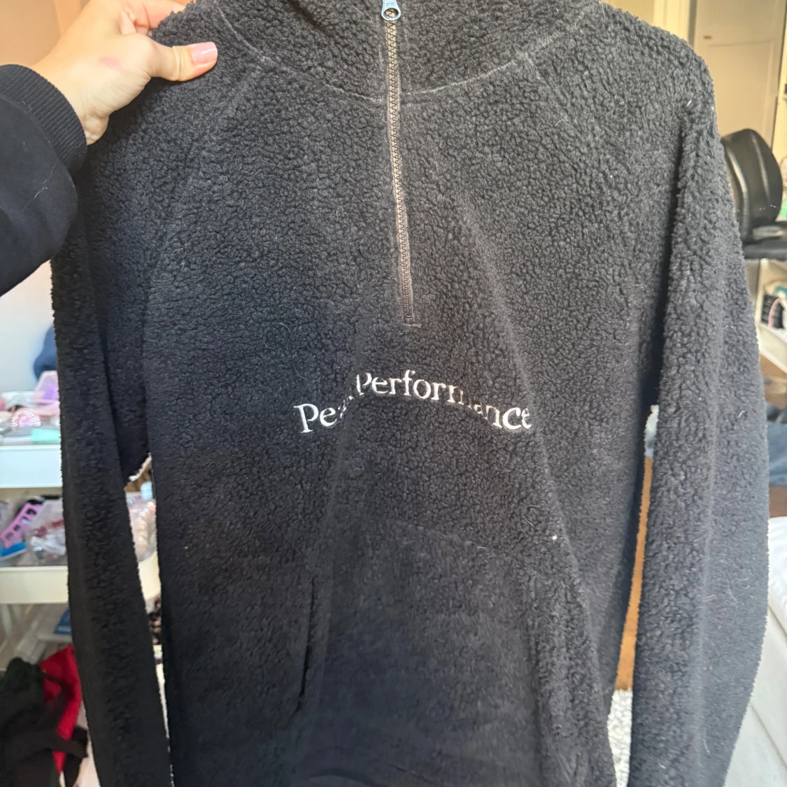 Mysig svart fleece hoodie från Peak Performance med broderad logga på bröstet. Tröjan har huva, lång ärm och en praktisk half zip framtill. Perfekt för kyliga dagar och riktigt skön att dra på sig när det är kallt ute.