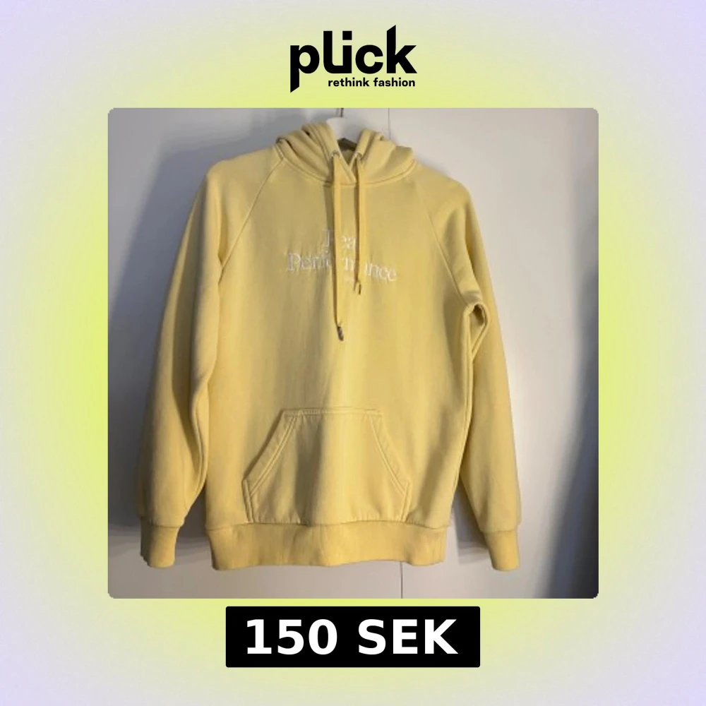Snygg ljusgul hoodie från Peak Performance med broderad logga på bröstet. Tröjan har huva med snörning, känguruficka och ribbade muddar. Snörningen är lite skadad som man kan se på bilden.