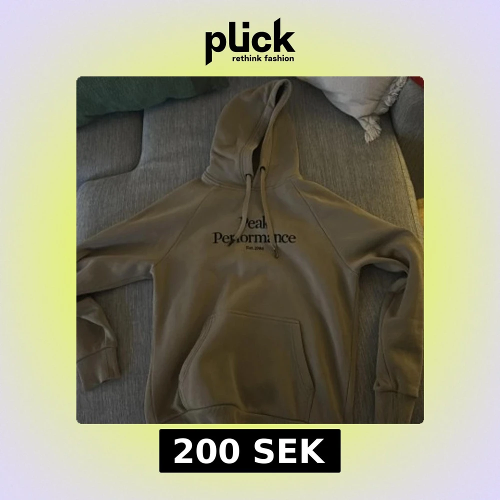 Säljer en snygg beige hoodie från Peak Performance med tryck framtill. Den har en klassisk design med justerbar huva och en stor magficka. Perfekt för en avslappnad stil.