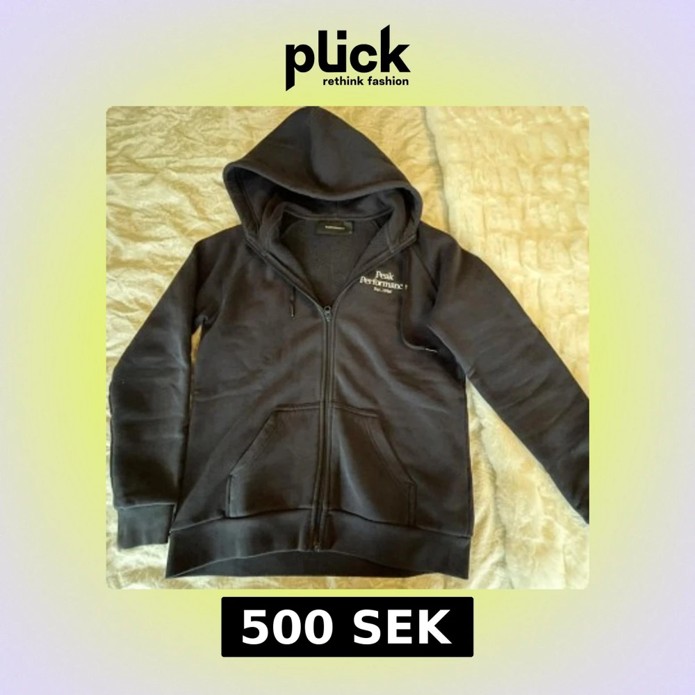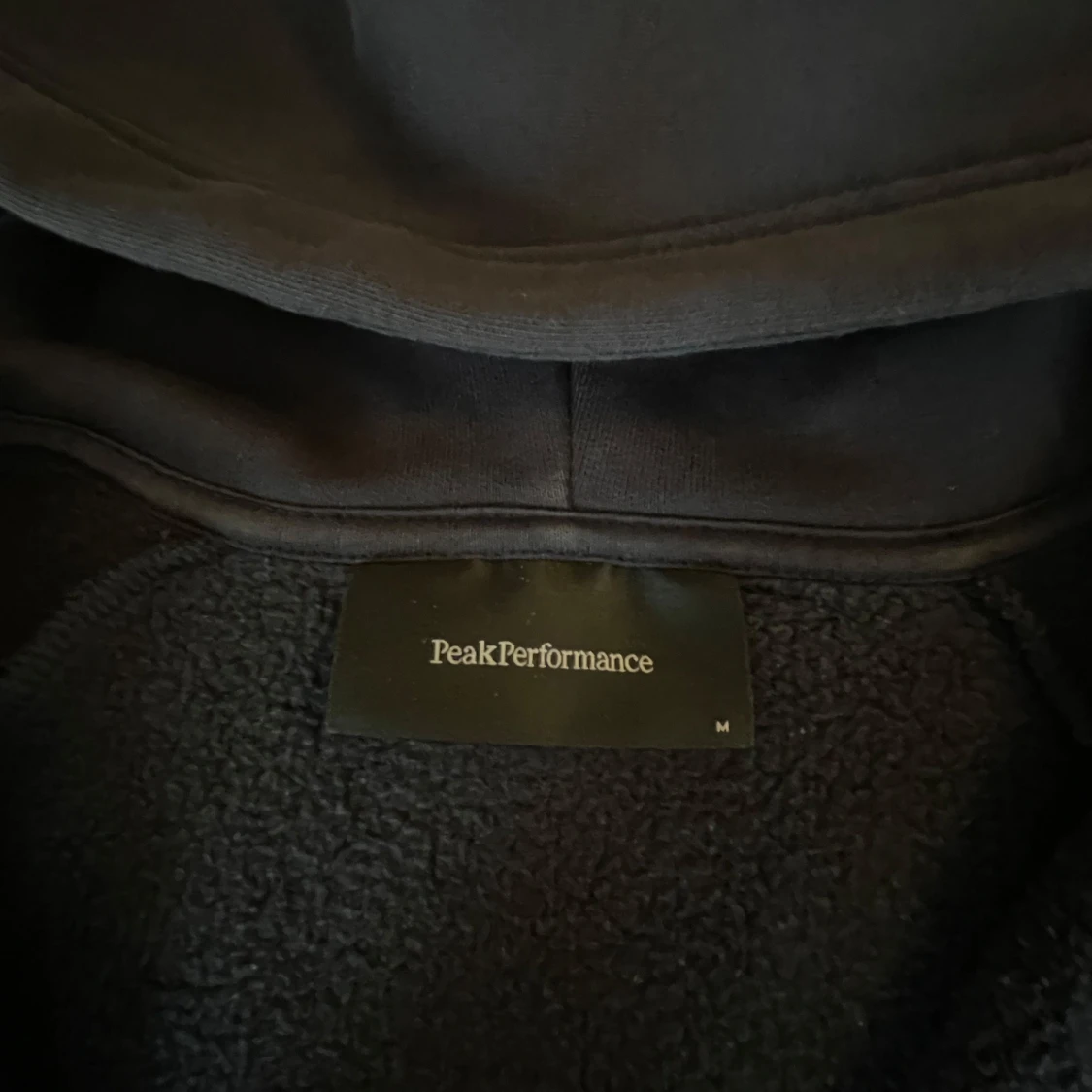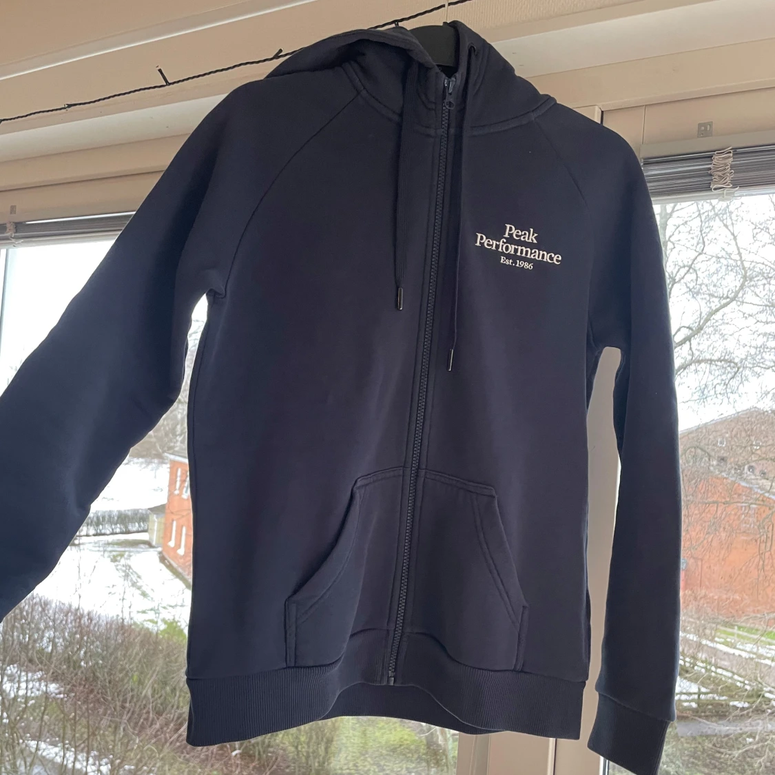 Marinblå hoodie från Peak Performance med dragkedja och huva. Pris kan diskuteras.