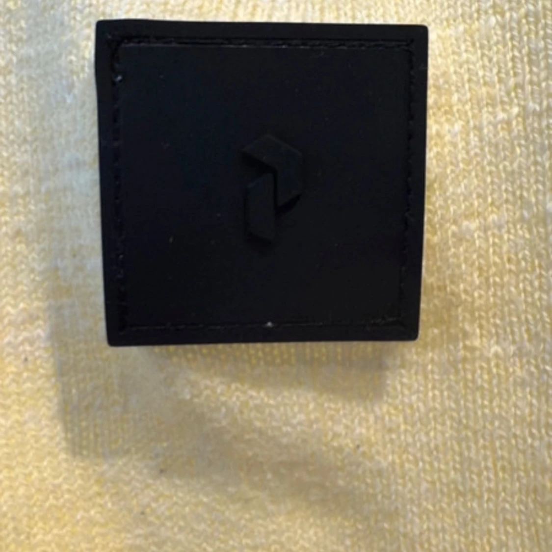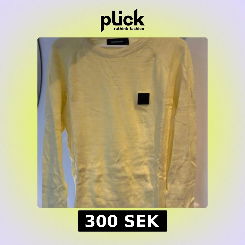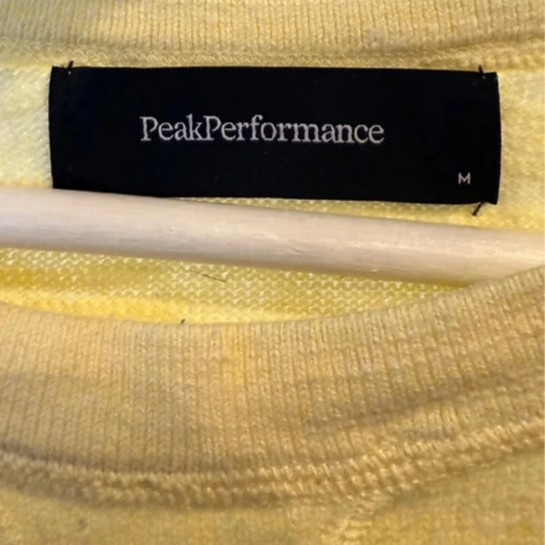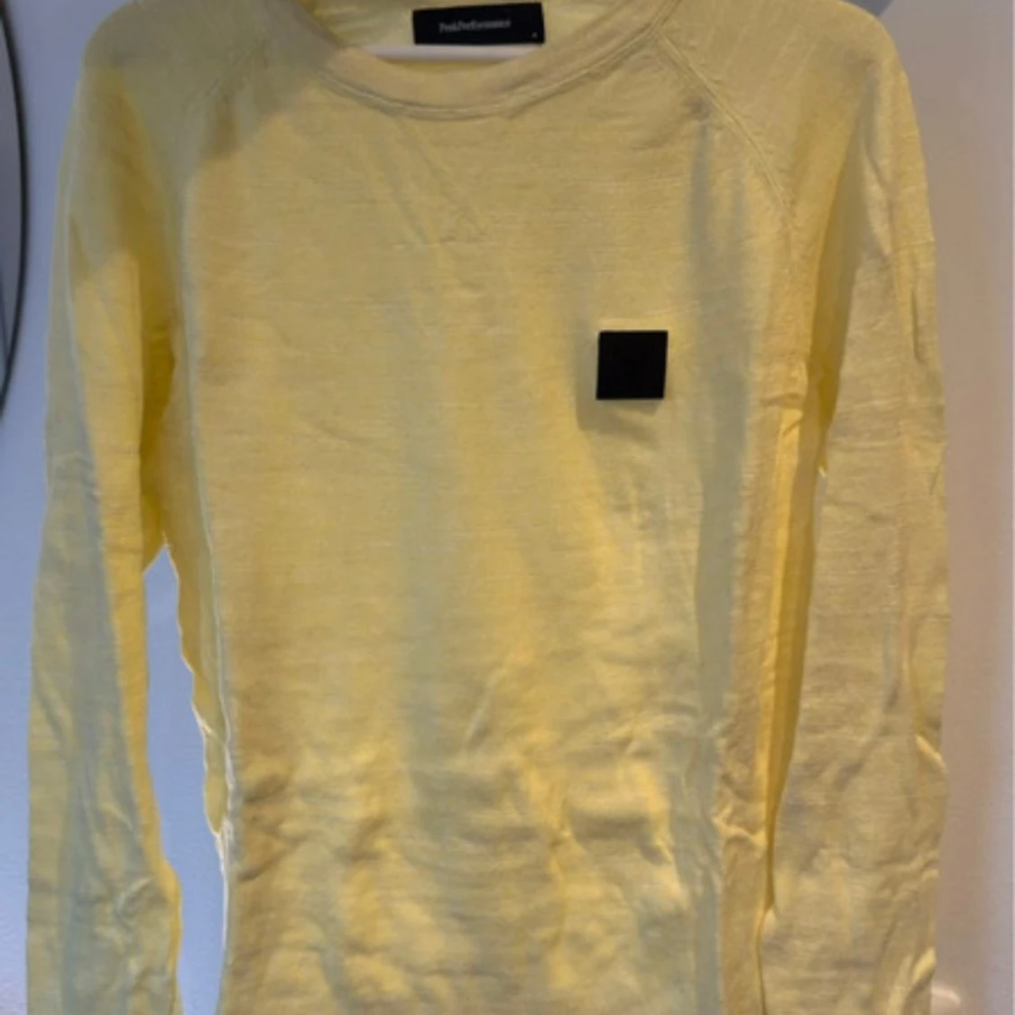 Säljer en stilren gul tröja från Peak Performance med lång ärm och en svart fyrkantig logga på bröstet. Perfekt för en avslappnad stil. Tröjan är i storlek M och har en klassisk passform.