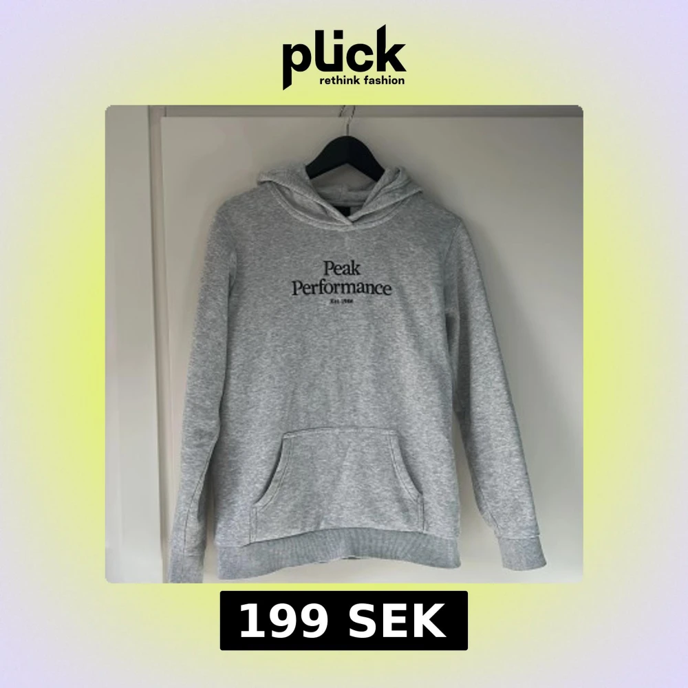 Säljer en stilren grå hoodie från Peak Performance med svart broderad logga på bröstet. Tröjan har huva och en stor magficka framtill. Perfekt för en avslappnad look.
