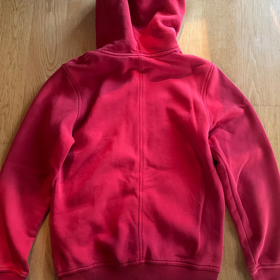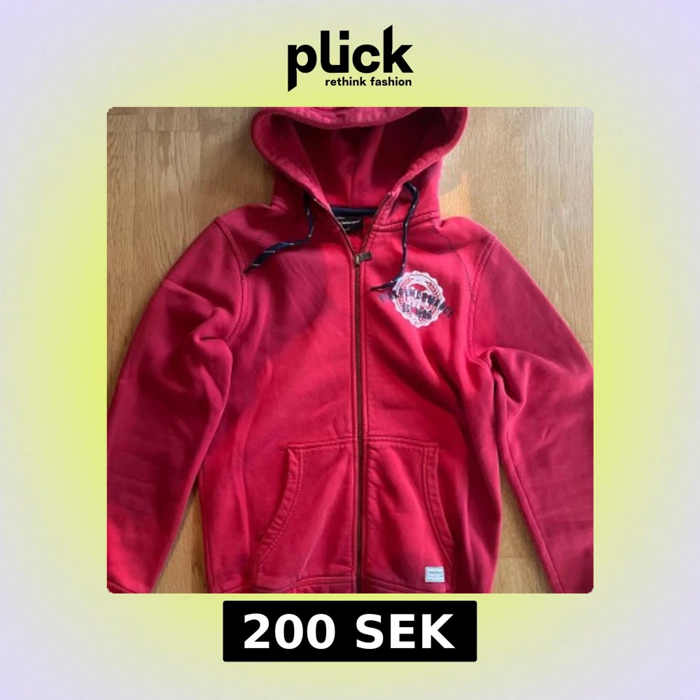 Röd hoodie från Peak Performance med dragkedja, huva och känguruficka. Tryckt logga på bröstet och snörning i huvan. Mjuk och skön bomullsblandning, perfekt för chill eller skola.
