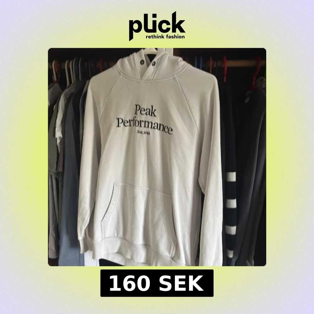 Säljer en stilren vit hoodie från Peak Performance med svart broderad logga på bröstet. Tröjan har huva med snörning, känguruficka och ribbade muddar. Perfekt för dig som gillar en clean och sportig look.