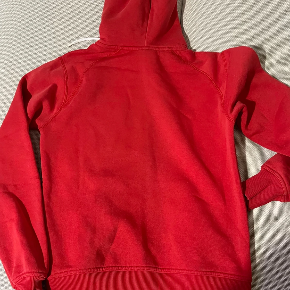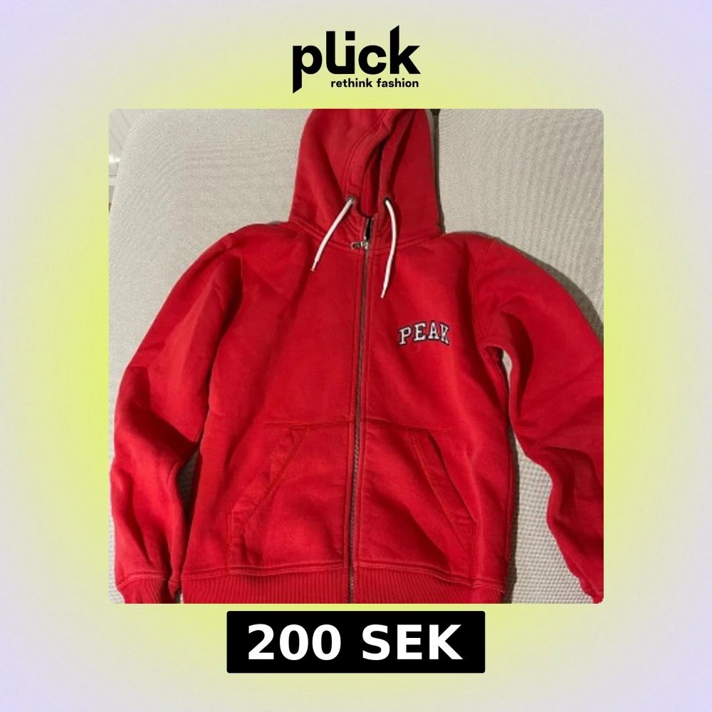 Röd hoodie från Peak Performance med dragkedja, huva med vita snören och broderad PEAK-logga på bröstet. Mjuk bomullskänsla, kängurufickor och ribbade muddar.