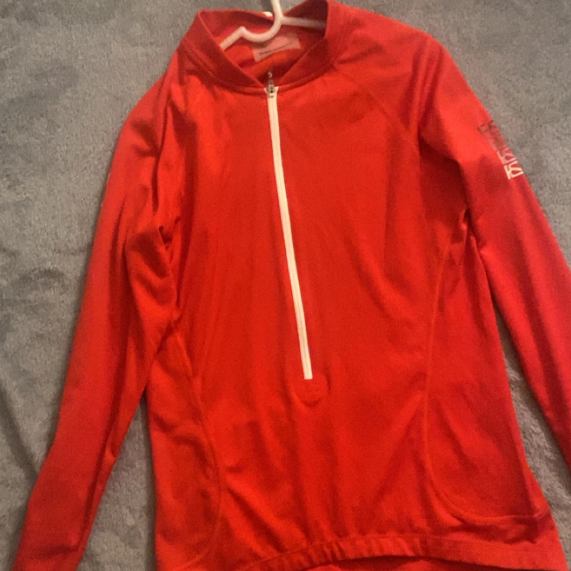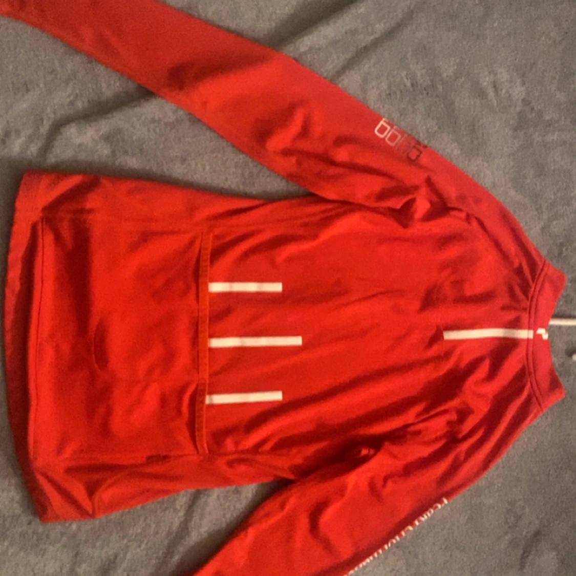 Röd långärmad träningströja från peekperformance med vit half zip framtill och reflexdetaljer på ryggen. Tight passform och tillverkad i syntetmaterial som andas, perfekt för löpning eller annan träning. Snygg sportig look med tryck på ärmen.