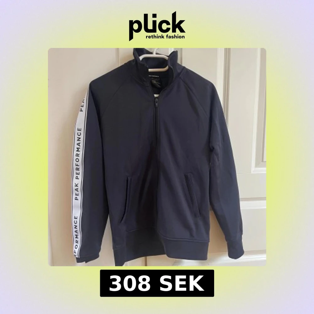 Snygg mörkblå hoodie från Peak Performance med dragkedja och höga krage. Längs ärmarna finns vita band med logotypen tryckt i svart. Tröjan har två fickor framtill och är tillverkad i mjuk bomullsmix, perfekt för chill eller träning.