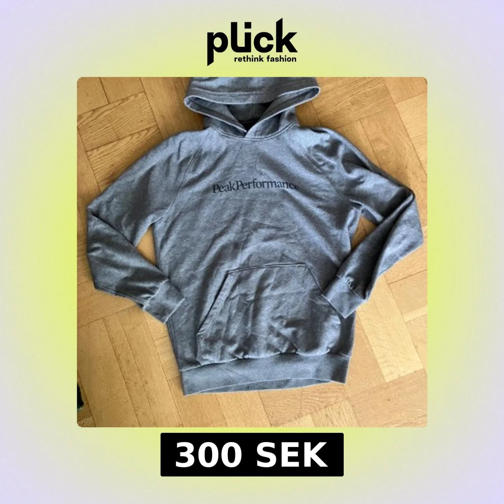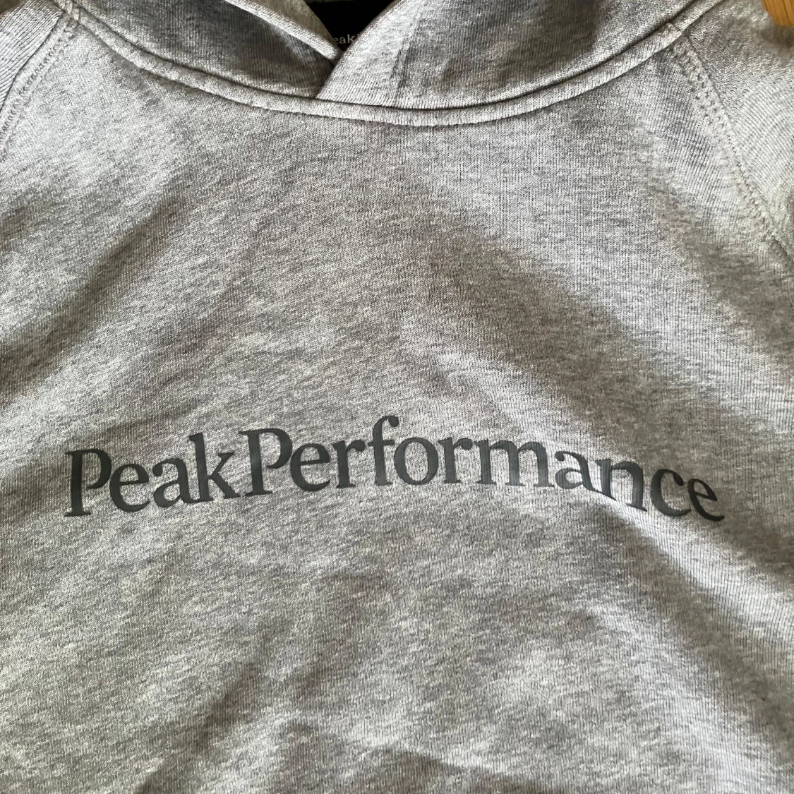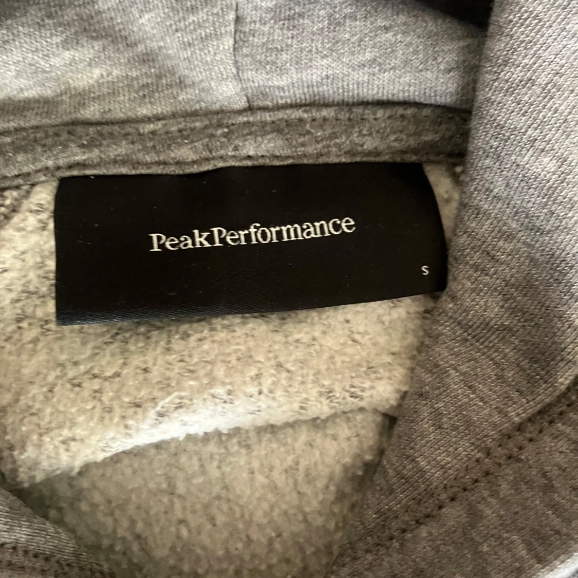 Snygg grå hoodie från Peak Performance med svart logga på bröstet. Klassisk känguruficka framtill, huva och mjukt fleecematerial på insidan. Perfekt för chill dagar eller när du vill ha en enkel och stilren look.
