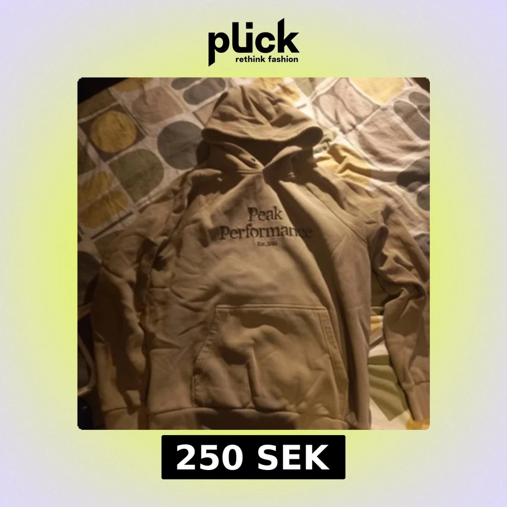 Säljer en beige hoodie från Peak Performance med tryck på bröstet. Den har en klassisk känguruficka och en justerbar huva. Perfekt för en avslappnad stil.
